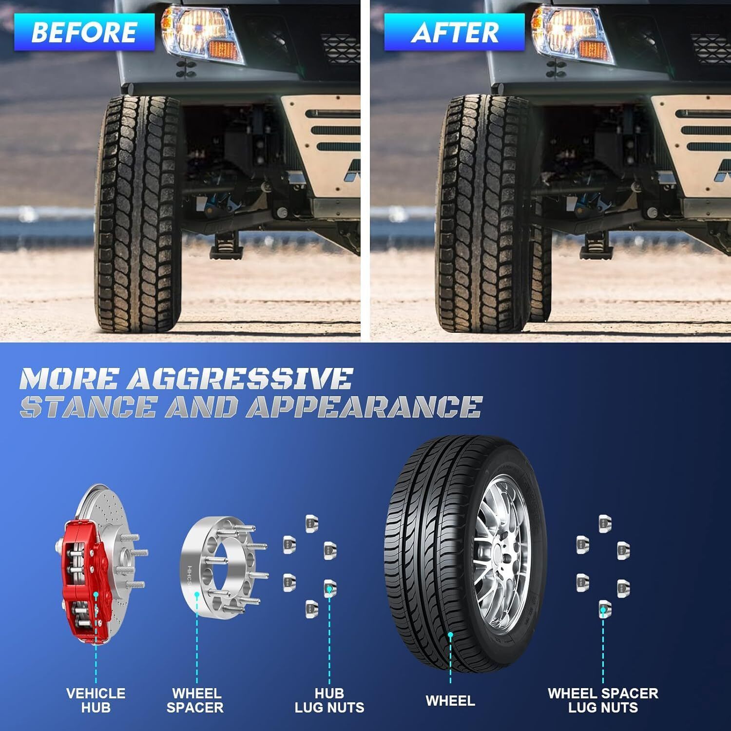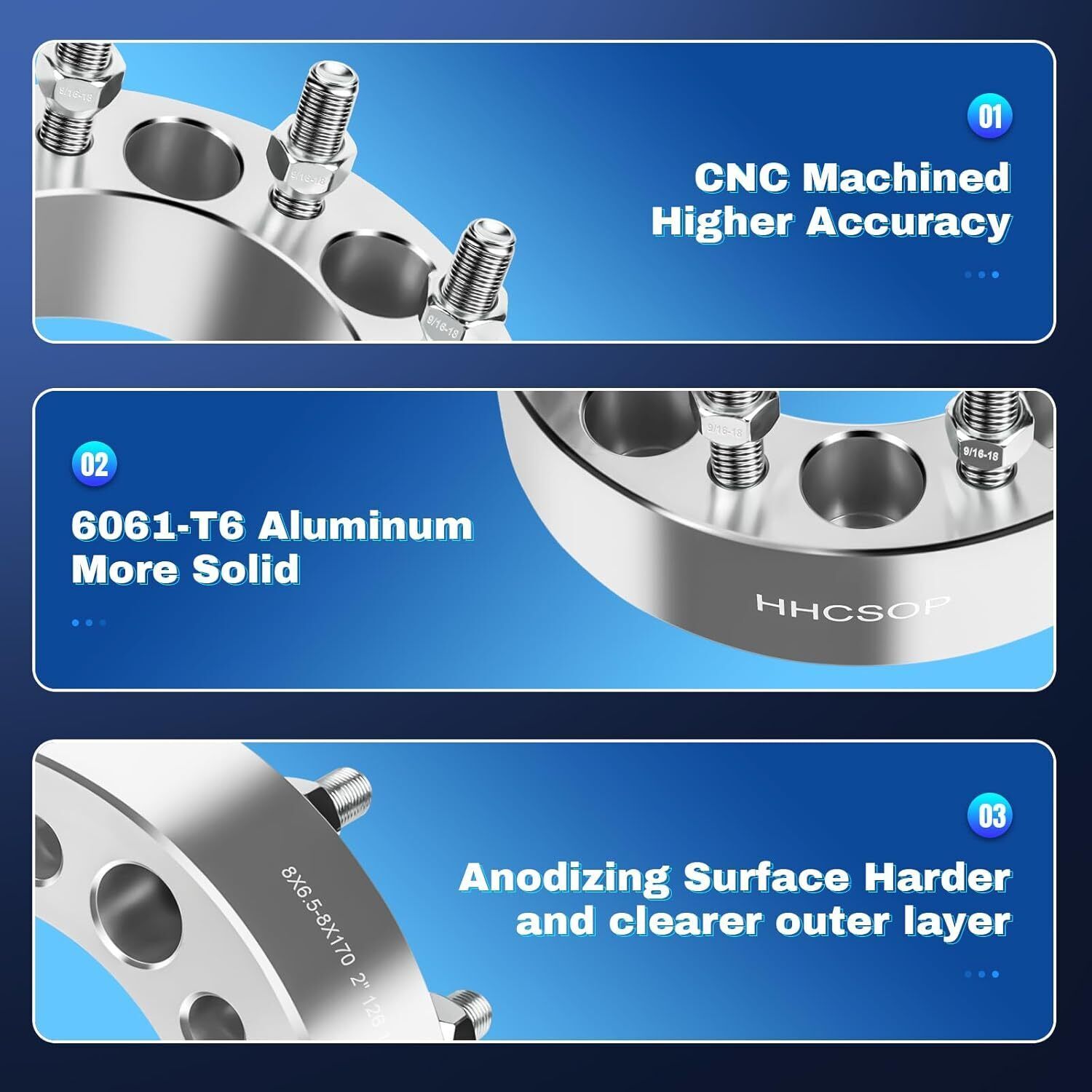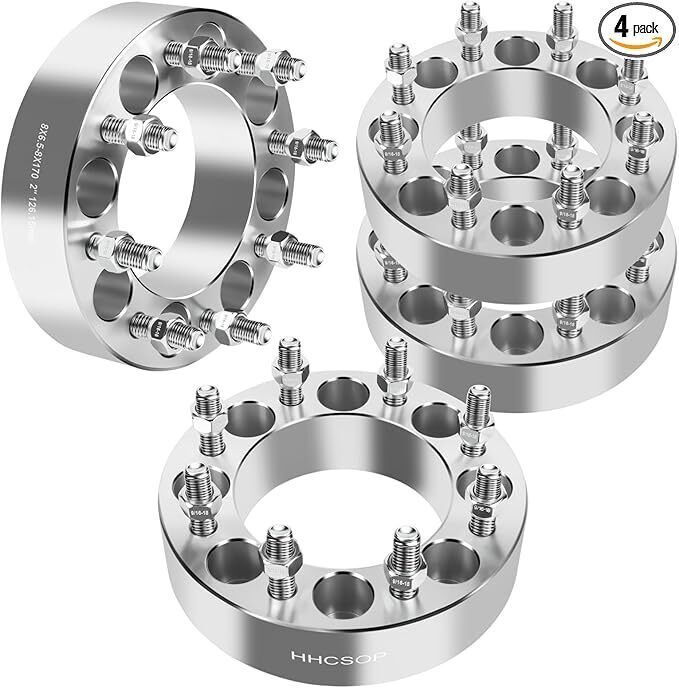 ? 4PCS Wheel Spacers: Thickness: 2" (50mm) | Vehicle Bolt Pattern: 8x6.5" (8x165.1mm) | Wheel Bolt Pattern: 8x170mm | Center Bore: 126.15mm | Thread Pitch: 9/16"-18. ? Ford Wheel adapters: Compatible with 1980-1998 Ford F-250, 1980-1996 Ford F-350, 1992-1999 Ford E-250 Econoline, 1993-2007 Ford E-350 Econoline. ? Dodge Wheel adapters: Compatible with 1995-2010 Dodge Ram 2500, 1995-2010 Dodge Ram 3500, 2011-2013 Ram 2500, 2011-2013 Ram 3500. ? Chevrolet Wheel adapters: Compatible with1977-1986 Chevrolet C20, 1980-1986 Chevrolet C30, 1980-1986 Chevrolet K20, 1980-1986 Chevrolet K30. ? High Quality: Forged from 6061-T6 aluminum alloy, CNC automatically machined to ensure high precision and stability, with anodized and heat-treated surfaces to enhance corrosion resistance, and comes with 10.9 grade premium studs. ? Spacer Features: Provide additional clearance between the wheel and hub assembly, thereby improving the vehicle's performance in terms of handling and traction. It will make your vehicle more stable and allow installation of lift/lowering kits and larger traction tires. ? Important Notes: Before purchasing these wheel spacers, please recheck your vehicle compatibility (year/make/model) in the product description. If you have any questions, please contact the customer service team for further assistance.