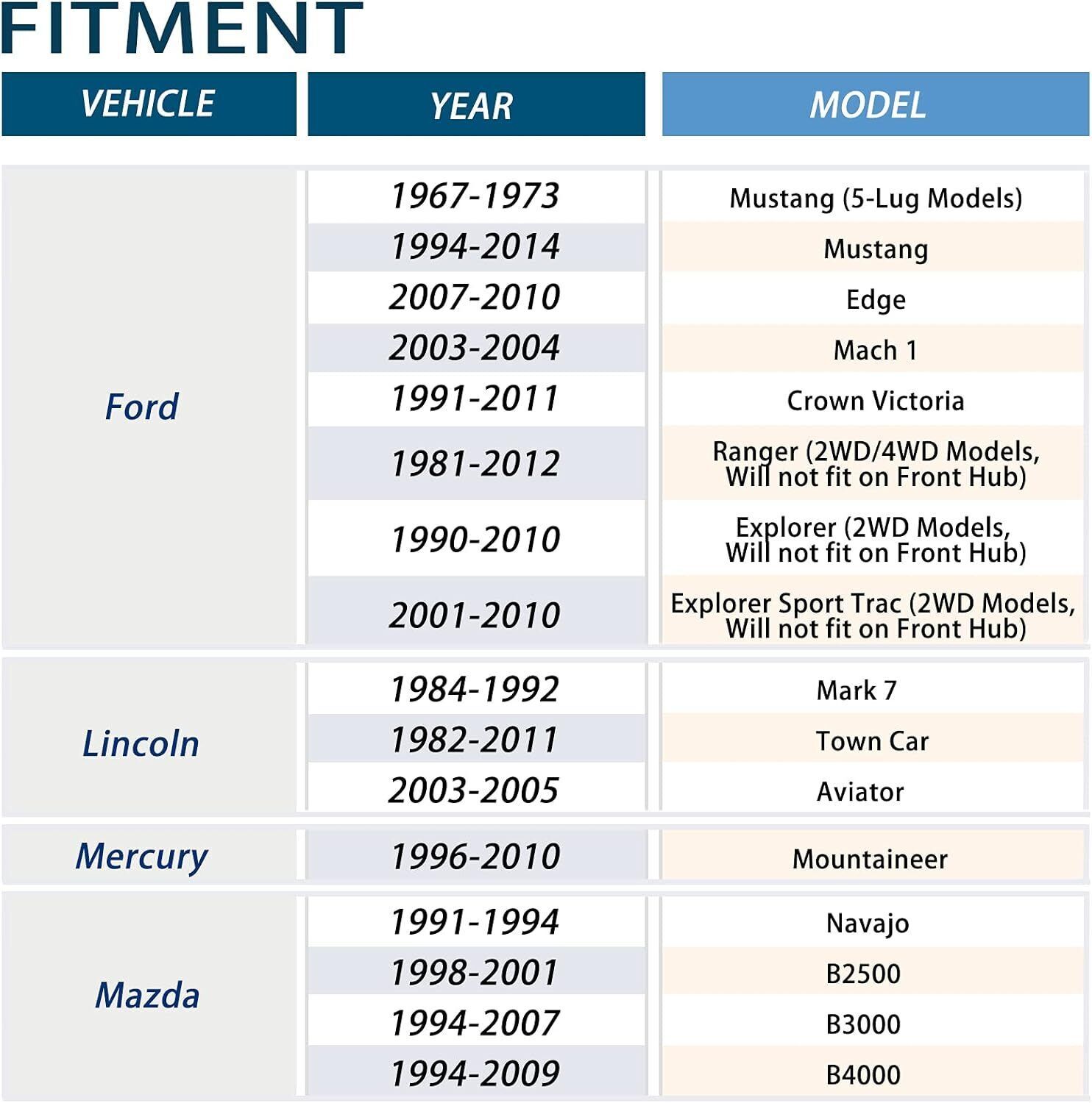 ? 2PCS Wheel Spacers: Thickness: 2" (50mm) | Vehicle Bolt Pattern: 5x4.5 (5x114.3mm) | Wheel Bolt Pattern: 5x4.5 (5x114.3mm) | Center Bore: 70.5mm | Thread Pitch: 1/2"x20. ? Ford Wheel adapters: Compatible with 1967-1973 Mustang, 1994-2014 Mustang, 2007-2010 Edge, 2003-2004 Mach 1, 1991-2011 Crown Victoria, 1981-2012 Ranger, 1990-2010 Explorer ? Lincoln Wheel adapters: Compatible with 1982-2011 Town Car, 2003-2005 Aviator, 1984 1985 1986 1987 1988 1989 1990 1991 1992 Mark 7 ? Mazda Wheel adapters: Compatible with 1991-1994 Navajo, 1998-2001 B2500, 1994-2007 B3000, 94 95 96 97 98 99 00 01 02 03 04 05 06 07 08 09 B4000 ? High Quality: Forged from 6061-T6 aluminum alloy, CNC automatically machined to ensure high precision and stability, with anodized and heat-treated surfaces to enhance corrosion resistance, and comes with 10.9 grade premium studs. ? Spacer Features: Provide additional clearance between the wheel and hub assembly, thereby improving the vehicle's performance in terms of handling and traction. It will make your vehicle more stable and allow installation of lift/lowering kits and larger traction tires. ? Important Notes: Before purchasing these wheel spacers, please recheck your vehicle compatibility (year/make/model) in the product description. If you have any questions, please contact the customer service team for further assistance.