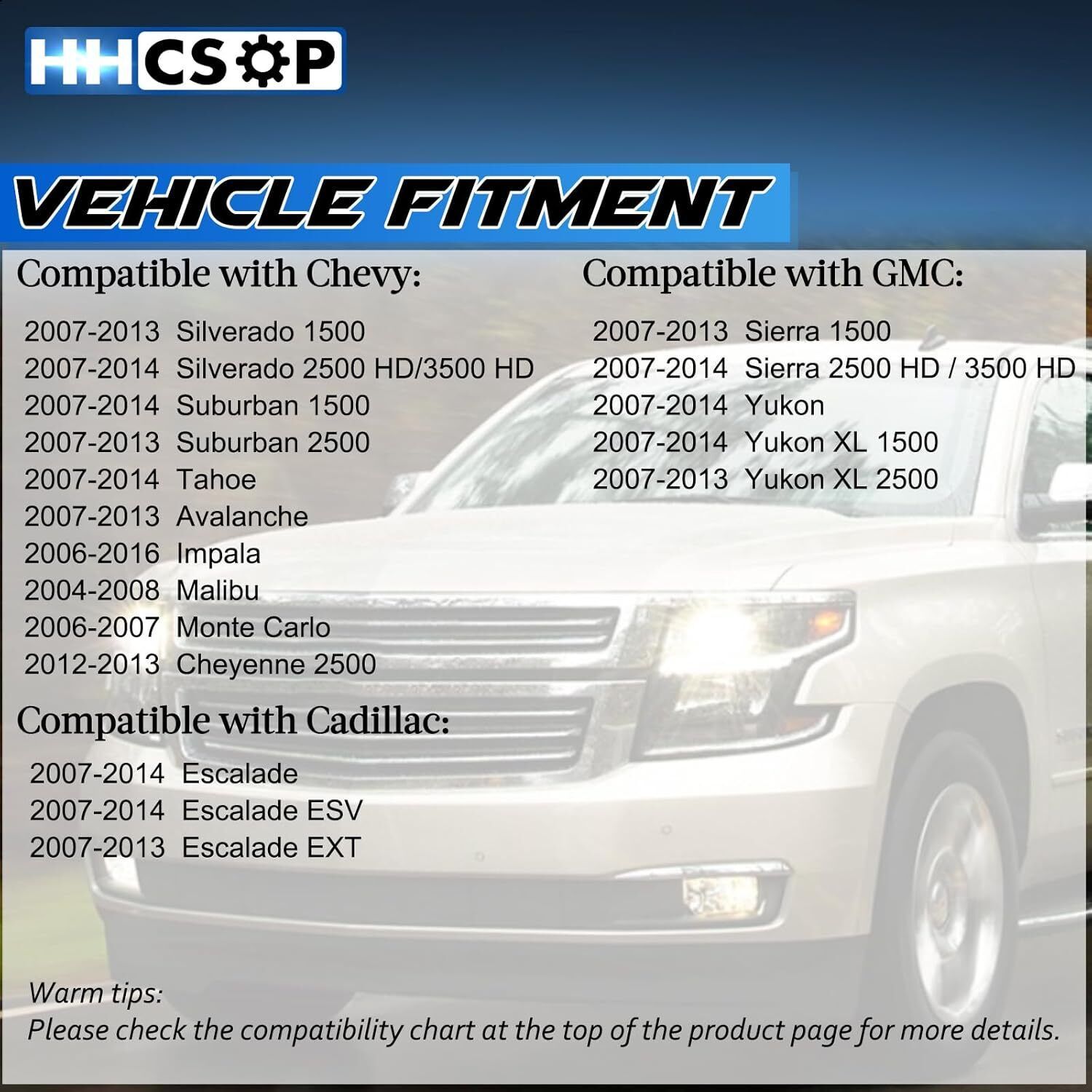 [Compatibility]: Front hood latch assembly fit for 2007-2013 Silverado 1500, 2007-2014 Silverado 2500 HD/3500 HD, 2007-2014 Suburban 1500, 2007-2013 Suburban 2500, 2007-2014 Tahoe, 2007-2013 Avalanche, 2006-2016 Impala, 2004-2008 Malibu, 2007-2013 Sierra 1500, 2007-2014 Sierra 2500 HD / 3500 HD, 2007-2014 Yukon, 2007-2014 Escalade More details, please refer to the vehicle information below [Replace OE Number]: 15139168, 20763454, 20763655, 25816904, 15850357, 15901322, 15827174, 25793774, 22687904, 25868007 [Installation Position]: Front Hood [Features]: HHCSOP door lock latch actuators are manufactured from premium materials to ensure optimum durability and reliable performance, meeting or exceeding stringent OEM specifications. If the front hood latch is faulty, we recommend replacing the actuator to resolve locking and unlocking issues, ensuring easy operation for the front hood [What You Get]: 1 x Front Hood Door Latch. If you have any concerns or issues, please reach out to customer service