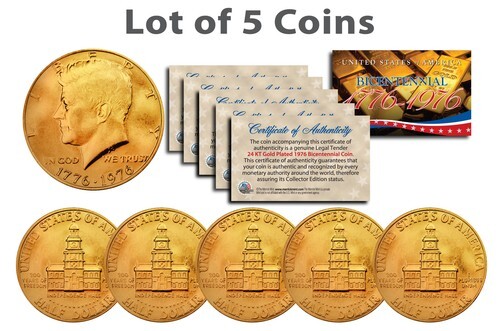 Bicentennial 1976 JFK Half Dollar US Coins 24K GOLD PLATED w/Capsules *Lot of 5*
