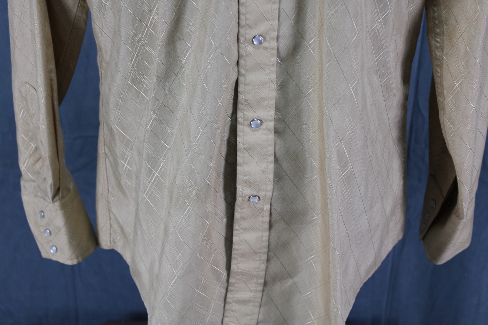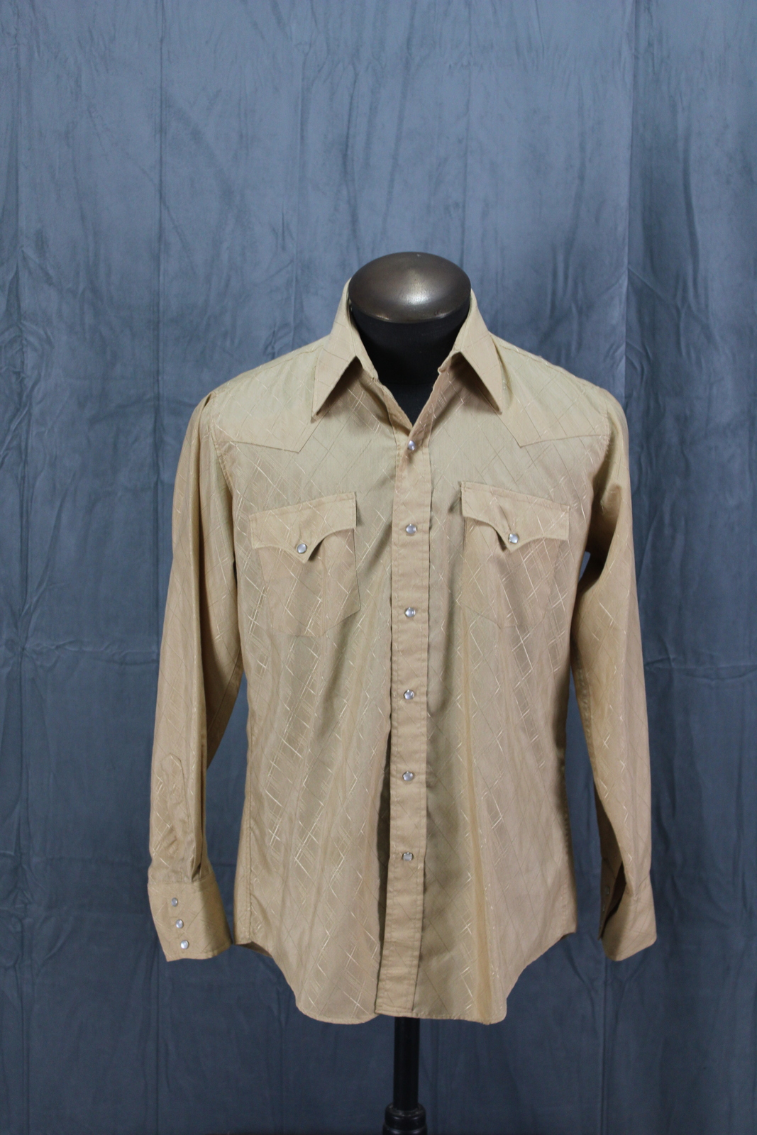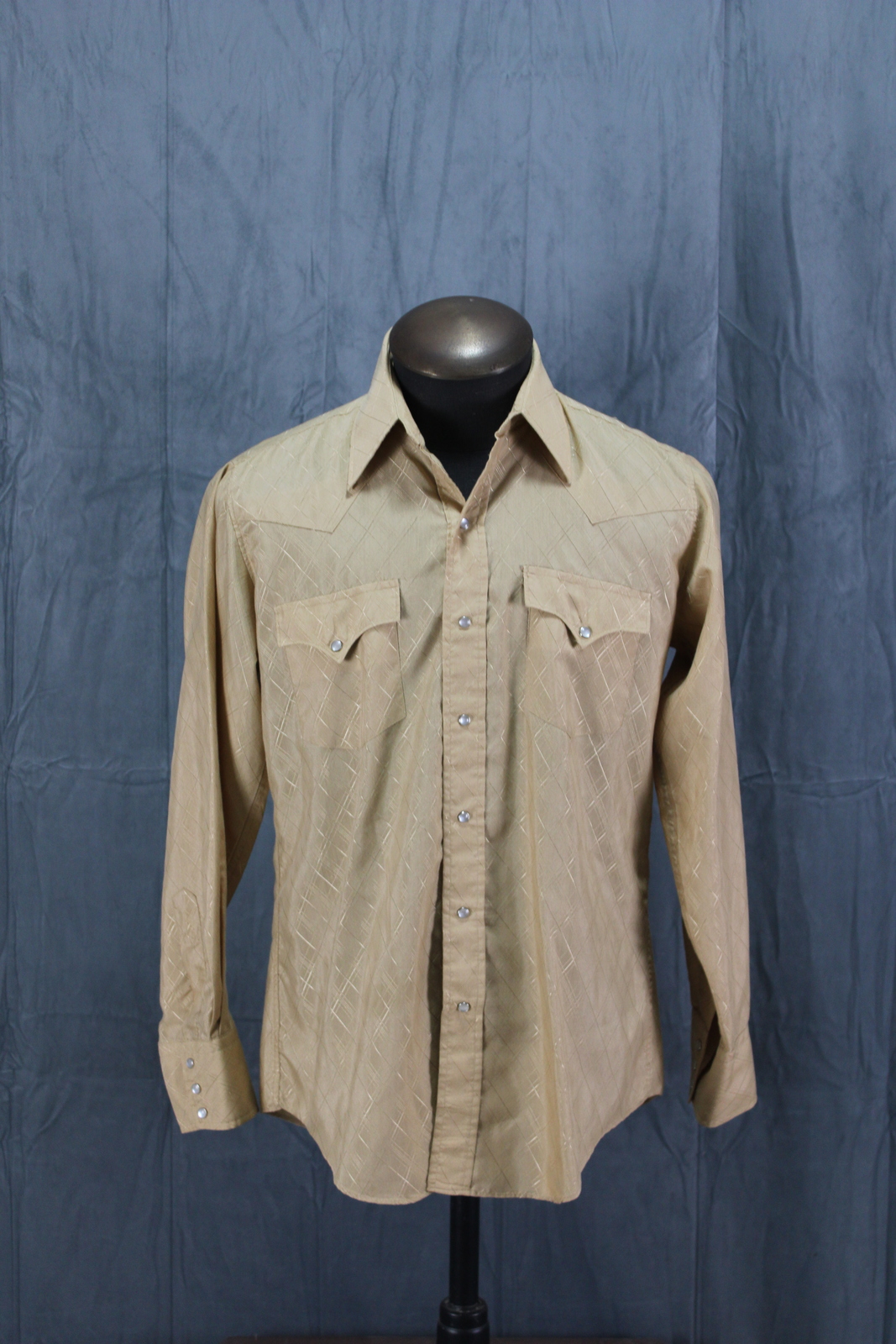 Up for sale is a vintage western shirt. It has a beige base colour with a translucent diamond pattern inlaid over top. All closures on the shirt are pearl snaps. What a great vintage shirt do not miss out on it.
