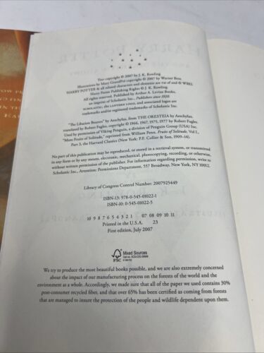 The product is a first edition hardcover book titled "Harry Potter and the Deathly Hallows" by J.K. Rowling, published in 2007 by Scholastic, Incorporated. It is part of the Harry Potter series and features illustrations by Mary Grandpre. The book is in English, with a total of 784 pages, and includes special attributes such as being a first printing and a first edition. The narrative is fiction, with themes of fantasy, magic, school, education, and adventure. Additionally, it comes with a dust jacket.