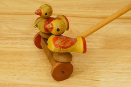 Vintage Wood Push Rolling Spinning Toddler Toy Red Yellow Ducks Hand Painted - The handle is 18" long and the duck section is 5" by 3.75" - dates to the 1930-50s time frame. Estate find.