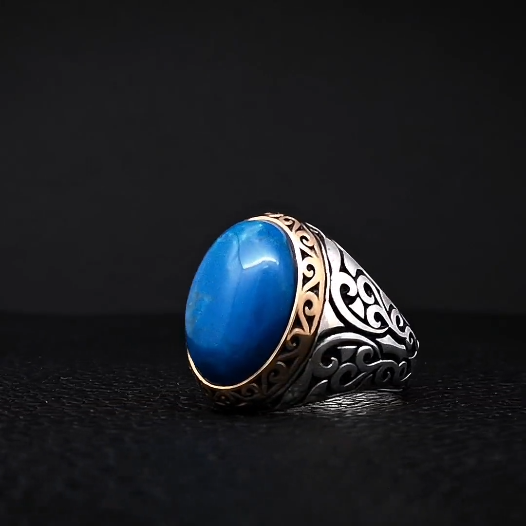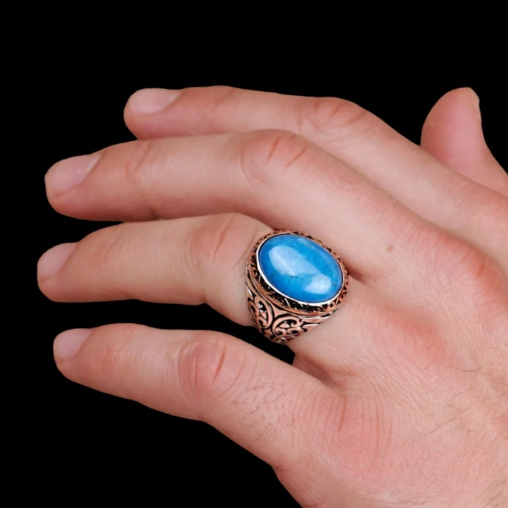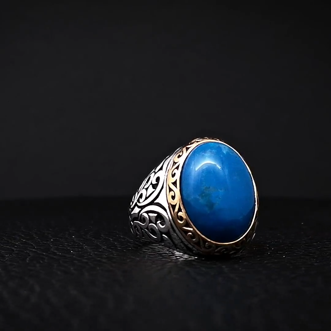 Solid 925 Sterling Silver Natural Blue Copper Turquoise Oval Cab Gemstone Bohemian Men's Ring , Official Men's Ring , Turkish Blue Turquiose Gemstone Tow Tone Ring , Wedding Ring , Birthday Gift Ring , Anniversary Engagement Ring , Ring Gift For Family Friends