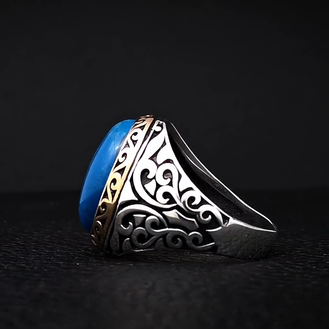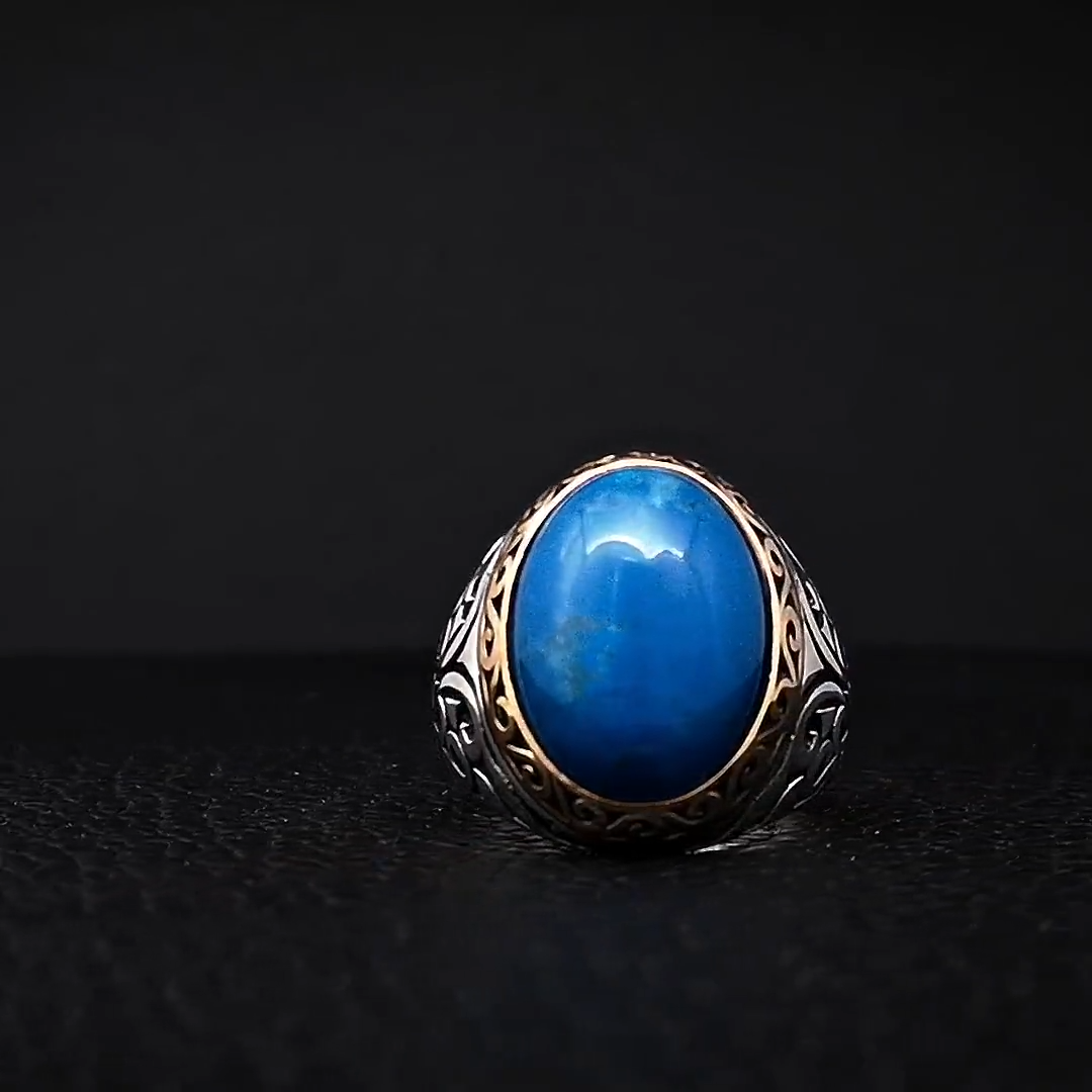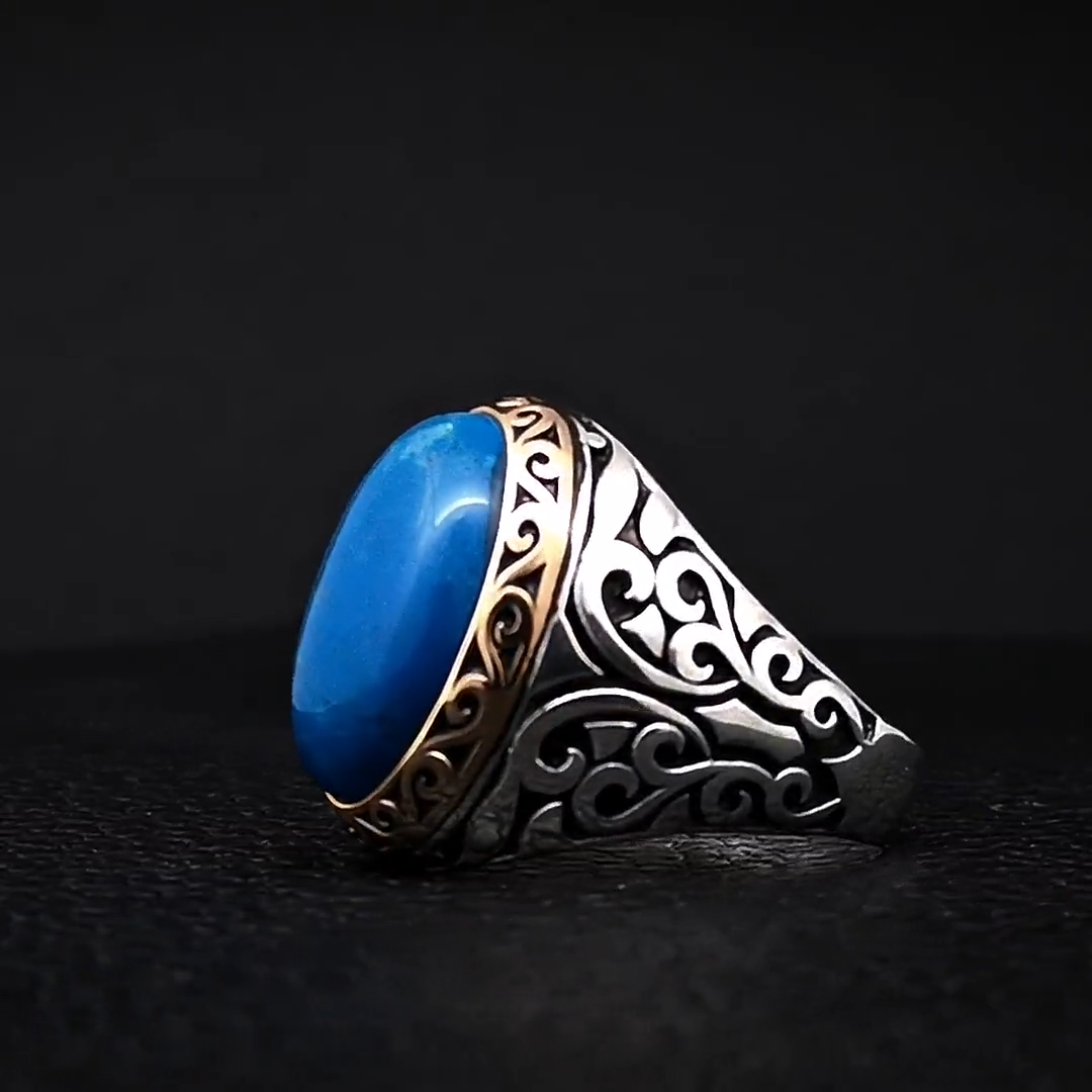 Solid 925 Sterling Silver Natural Blue Copper Turquoise Oval Cab Gemstone Bohemian Men's Ring , Official Men's Ring , Turkish Blue Turquiose Gemstone Tow Tone Ring , Wedding Ring , Birthday Gift Ring , Anniversary Engagement Ring , Ring Gift For Family Friends