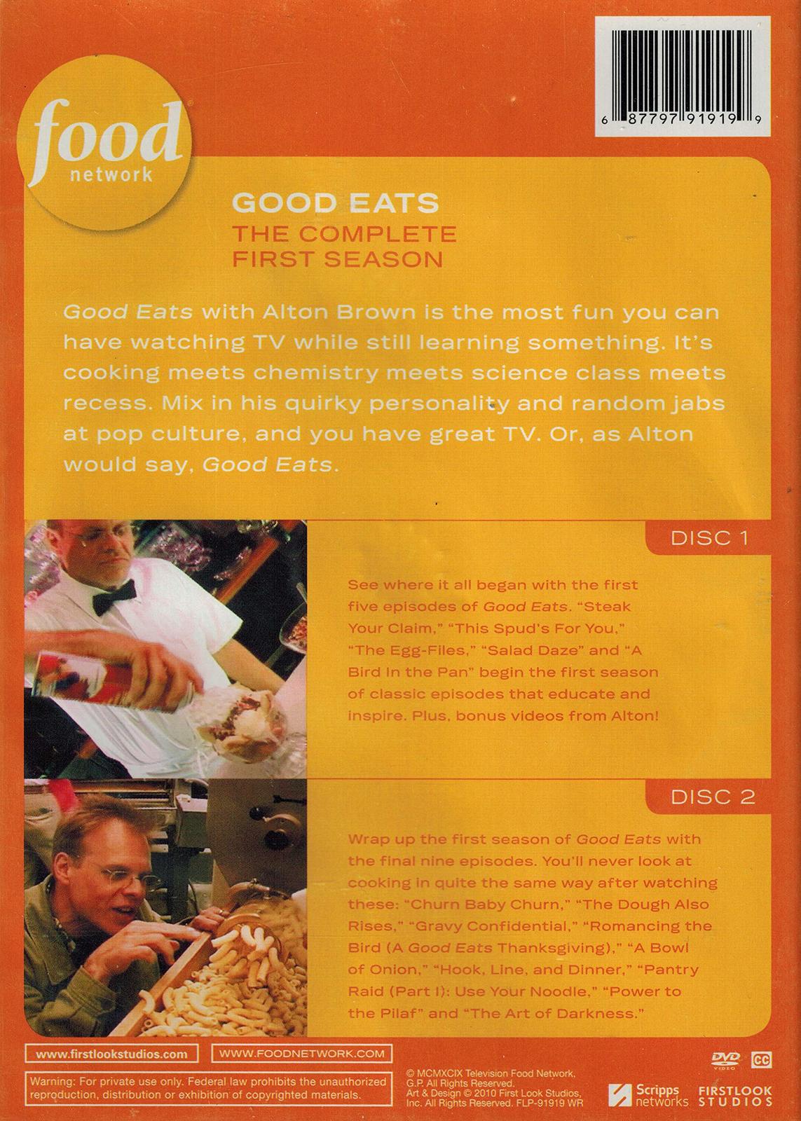 Disc 1: See where it all began with the first five episodes of Good Eats. "Steak Your Claim," "This Spud's For You," "The Egg-Files," "Salad Daze" and "A Bird in the Pan" begin the first season of classics episodes that educate and inspire. Plus, bonus videos from Alton!