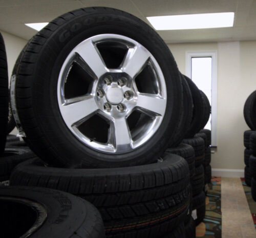 This is a set of 4 New Polished 20 inch LTZ Style replica wheels with 275/55R20 Goodyear Eagle LS2 tires for Chevrolet Silverado, Avalanche, Suburban, Tahoe.