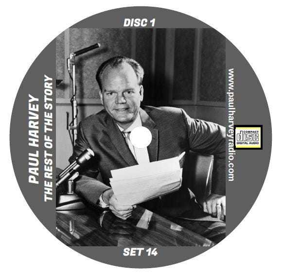 This listing is for (SET 14) 100 episodes of Paul Harvey: The Rest of the Story on 5 audio CDs. These discs have been recorded in standard audio format, and will play in any standard (audio) CD player. Each disc comes in a 5mm plastic clamshell CD case. All discs are fully guaranteed, and will be replaced if damaged or defective. Thanks for looking, and I hope you enjoy the shows.