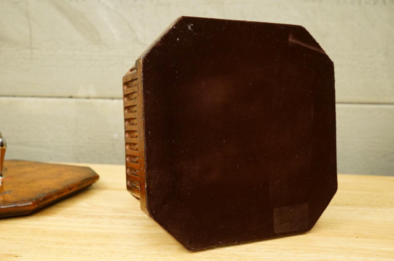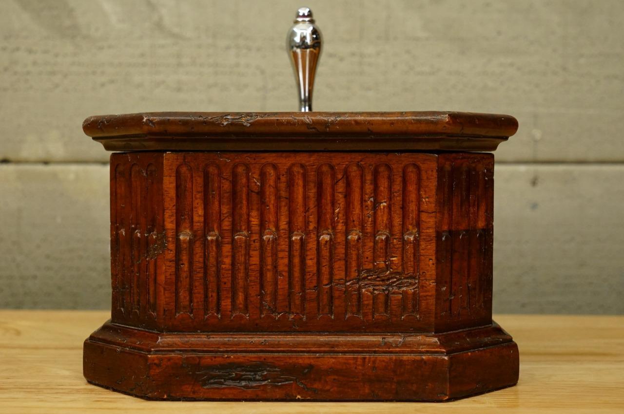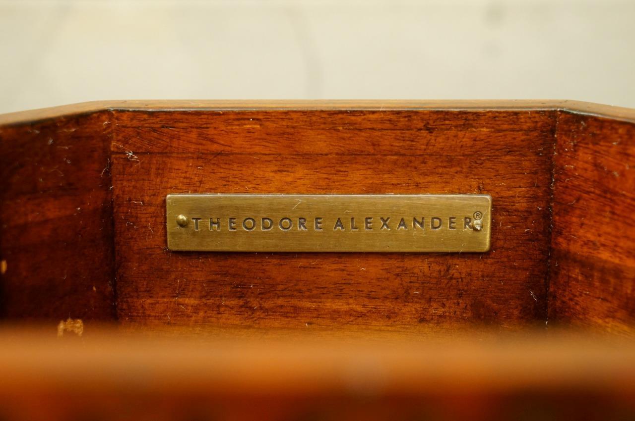 Vintage Theodore Alexander Covered Wood Storage Box Octagonal Tea Caddy. Fitted lid and base. Original company name plate inside the box. We do not know if the metal handle is original to the piece or a later replacement as some red staining is noted around the base of the handle. Solid wood. Distressed on purpose in the factory. Measures 5" tall and 7.75" across the top. No smoke or pet odors.