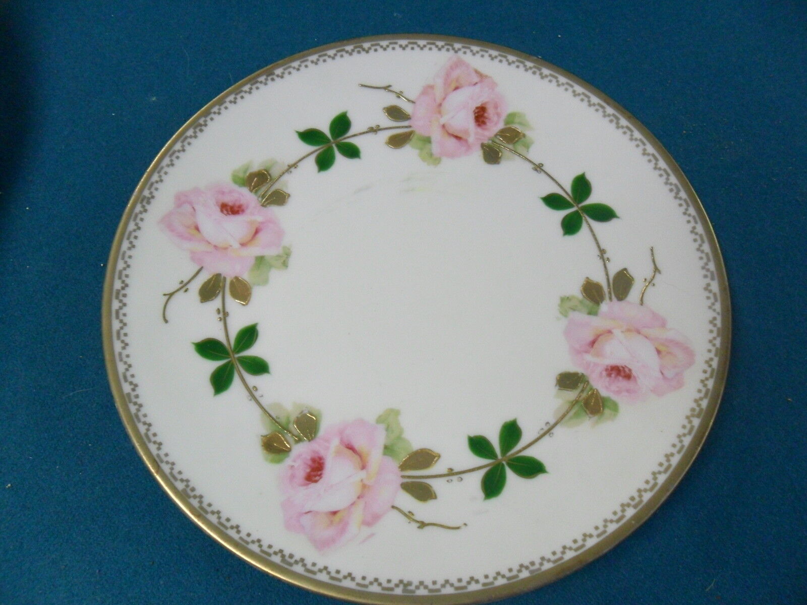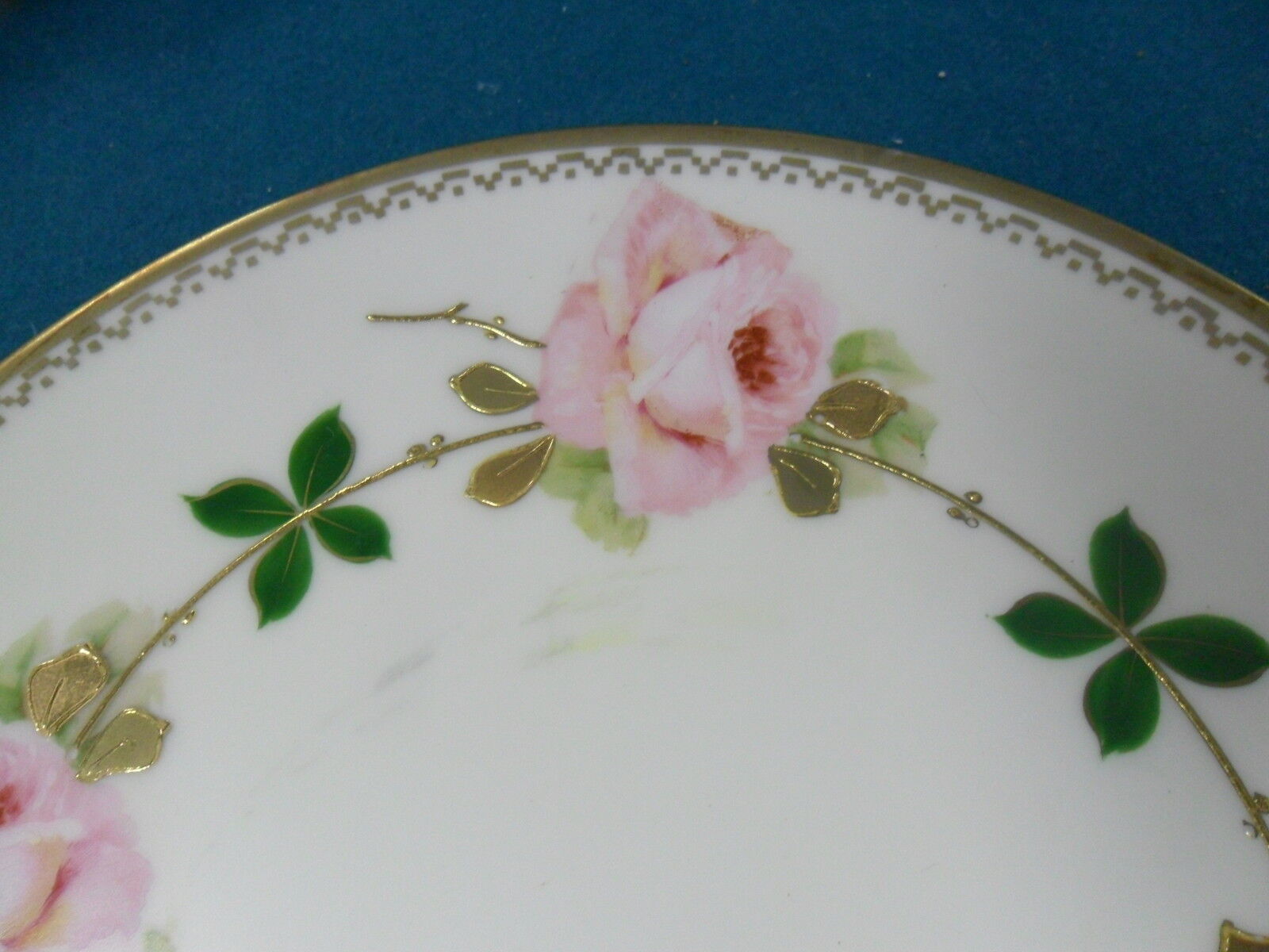 Porcelain Moschendorf Factory, Bavaria, Germany collector plate pink flowers, gold rim., very good condition, some light surface scratches commensurate with age ]a4-1-upto9]