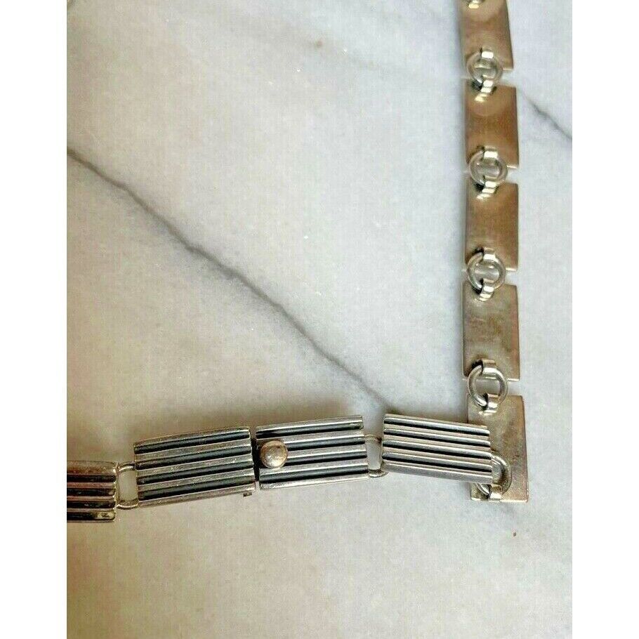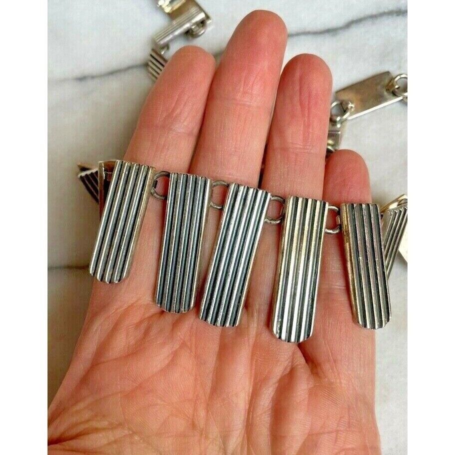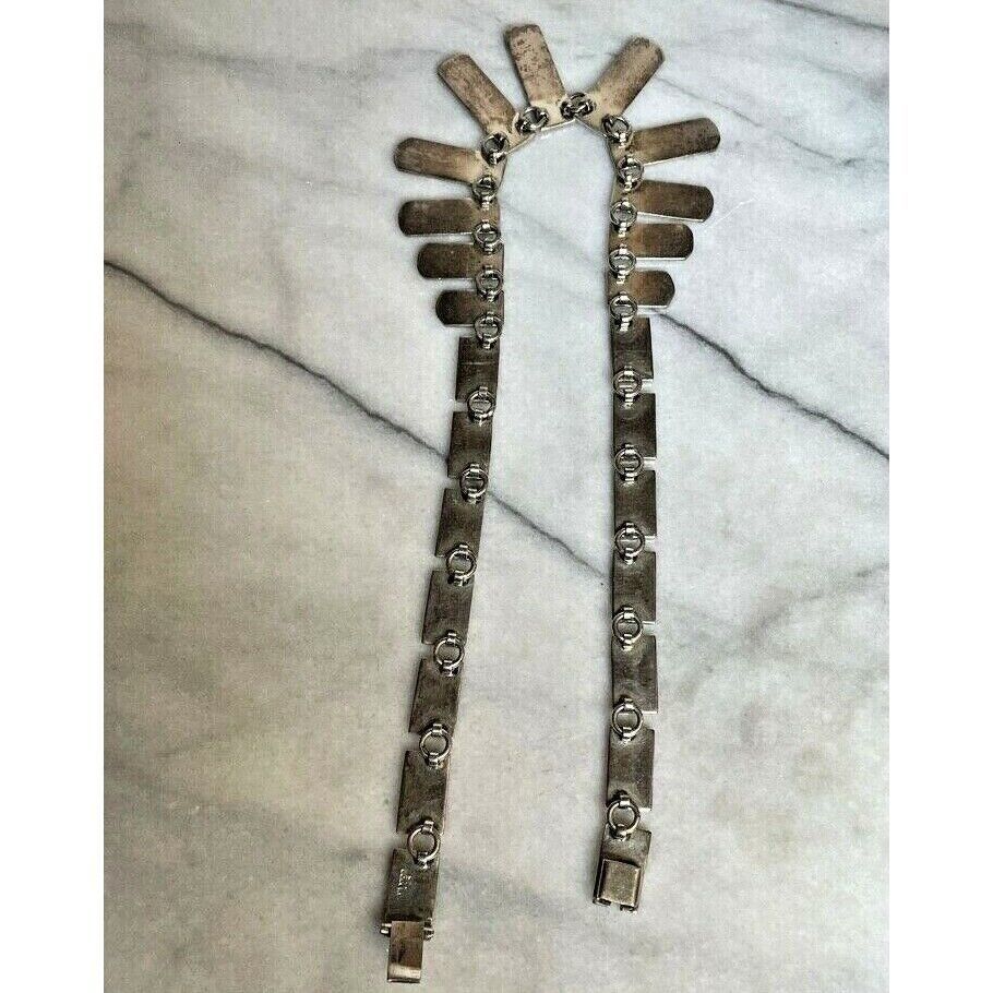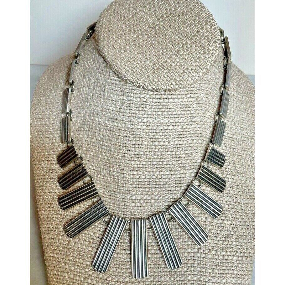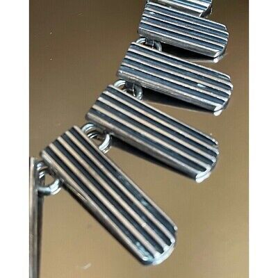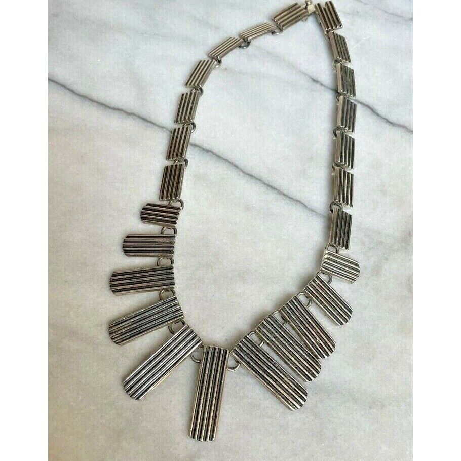 BEAUTIFUL MID-CENTURY MODERNIST NECKLACE.SIZE:APPROX.16'' x 1 1/4''.CONSTRUCTED OF RIBBED BARS,WEIGHS 89.1 GRAMS.MINOR TARNISH.WE CAN CLEAN IT UPON THE REQUEST BEFORE SHIPPING.