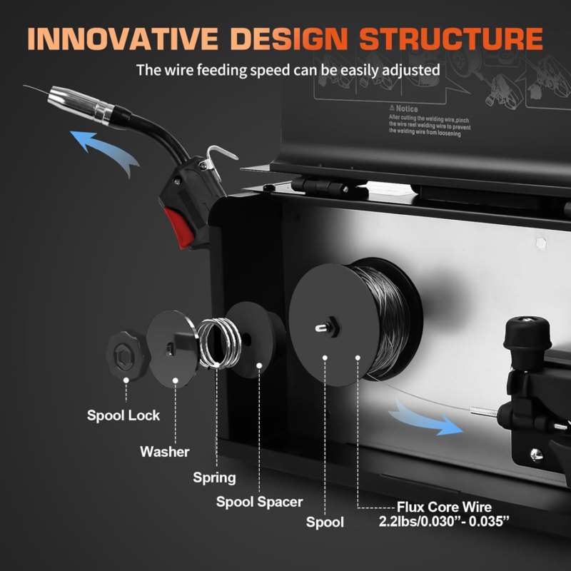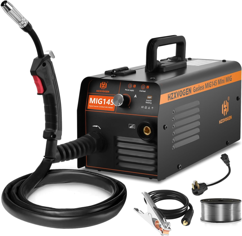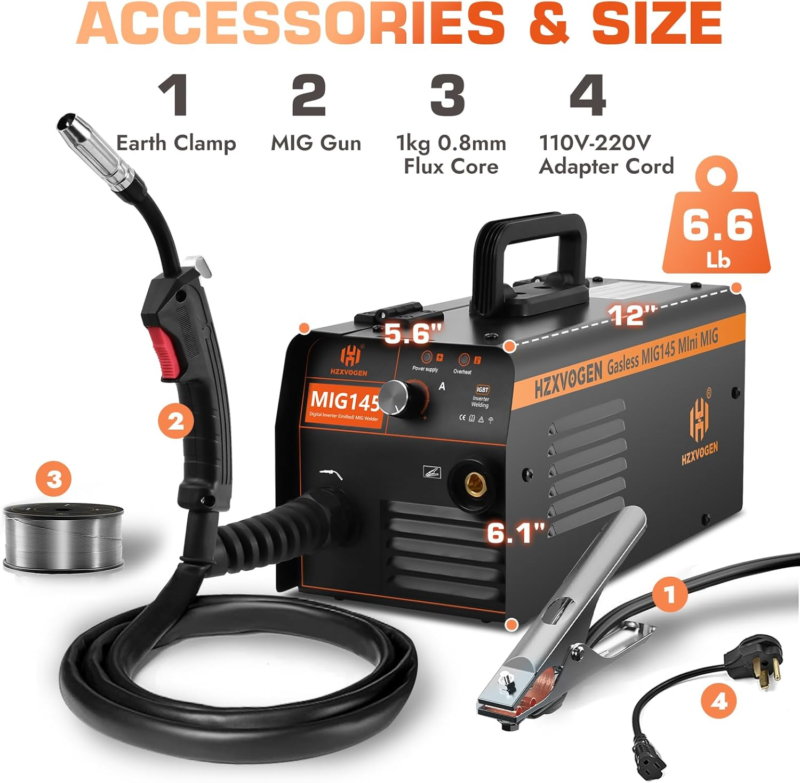 GASLESS FLUX-CORED MIG WELDER: Intelligent synergic MIG control, adjusting the amperage or choosing different wire thicknesses(.030/.035 inch flux core wire), the voltage and wire feeding speed will automatically change. Maximum output 145A allows you to weld plates up to 1-5mm thick, can handle 2.2 pound rolls of wire, it is ideal for a learning/entry level welder.