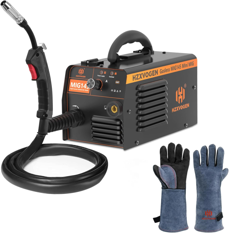 HZXVOGEN 145A MIG Welder 110V/220V Flux Core Welder Dual Voltage Gasless MIG Welding Machine IGBT Inverter Portable Welder Machine and 16 Inches 932? Heat Fire Welding Gloves for Arc Tig Mig Wood Stove Barking Oven Welder Gloves ? Free Size for Men Women