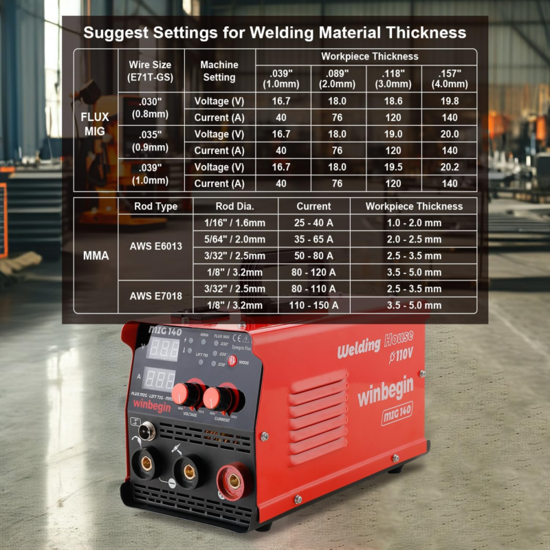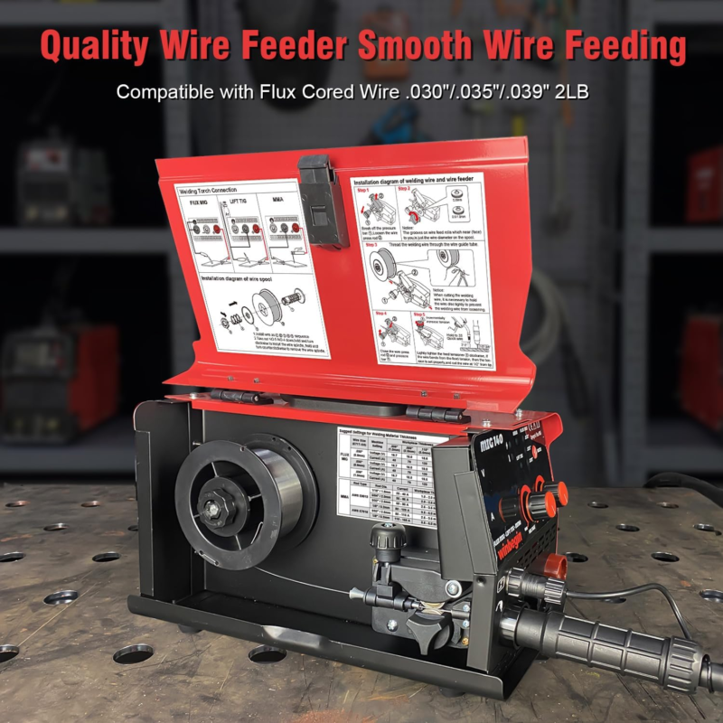 This winbegin 140A mig flux welder machine is compact, versatile and perfect for household welding needs as well as field welding jobs when camping.