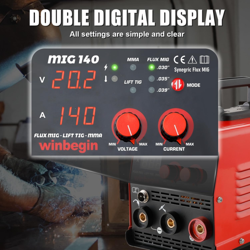 Dual LCD and Dual knobs: this mig welding machine it is easy to use with separate knobs to adjust the voltage and current,as well as LED displays for each value.
