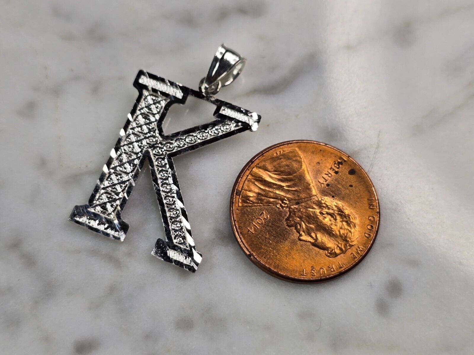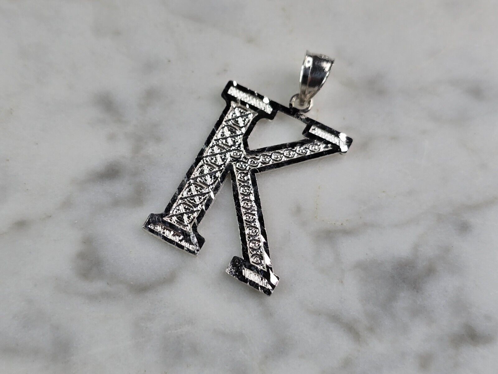 A WOMENS STERLING SILVER INITIAL LETTER "K" PENDANT. PENDANT WEIGHS 1.2g AND MEASURES 1 1/8" LONG BY 3/4" WIDE. MAKES A GREAT GIFT FOR THAT SOMEONE SPECIAL. ANY QUESTIONS, PLEASE ASK. BE SURE TO CHECK OUT OUR OTHER ITEMS FOR SALE.