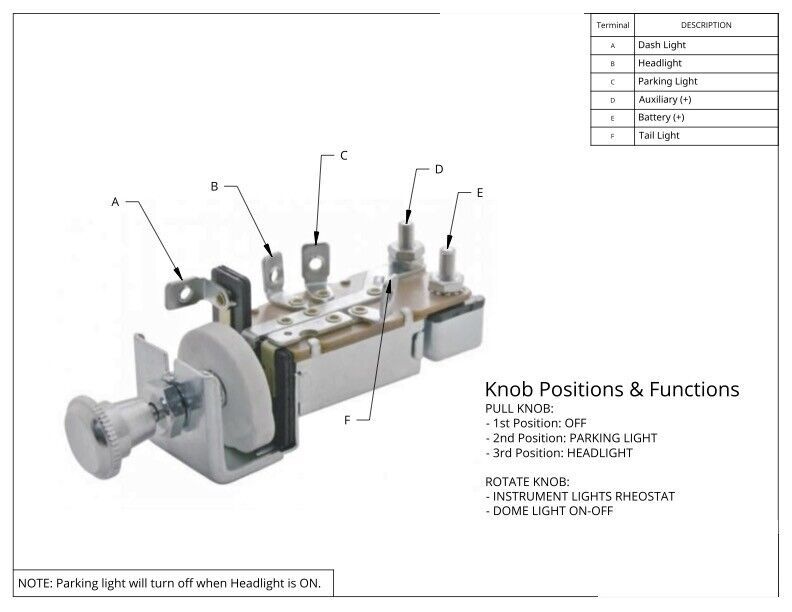 12V 6V; 20 Amp Circuit Breaker; Chrome Plated Metal Knob with Moutning Nut; Has Instrument Light Rheostat Dome Lamp Control; Parking light will turn off when headlight is on; May also work universally for other classic cars hot rods