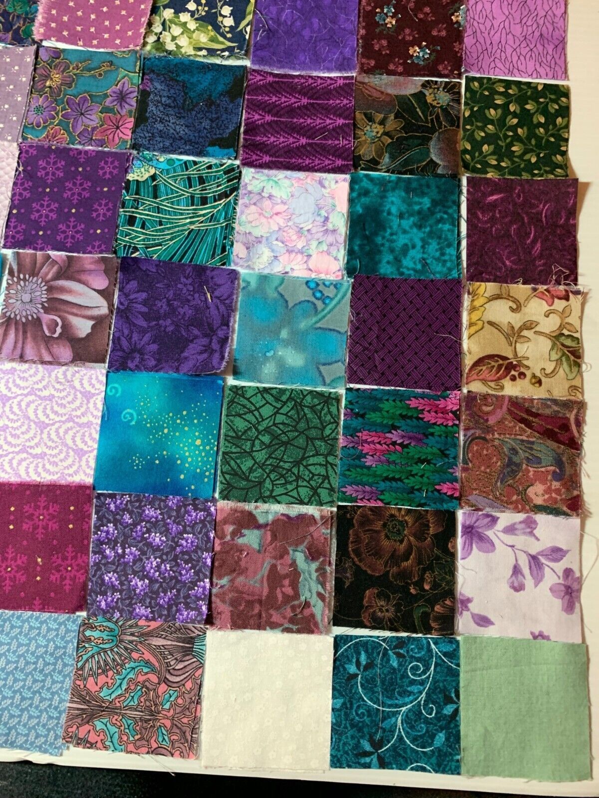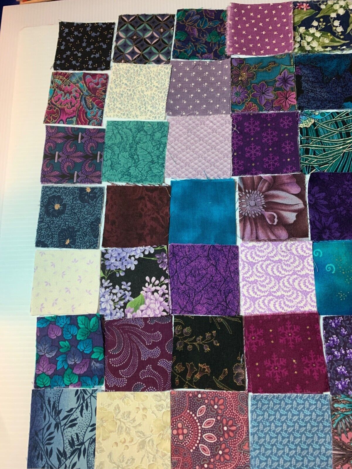 A charming collection of 112 vintage-inspired cotton quilting squares, each measuring 2.5 inches. These squares boast a diverse array of colors and patterns, perfect for crafting a quilt reminiscent of days gone by. The fabric's intricate designs and rich hues capture a timeless elegance, making it a lovely choice for nostalgic quilting projects.