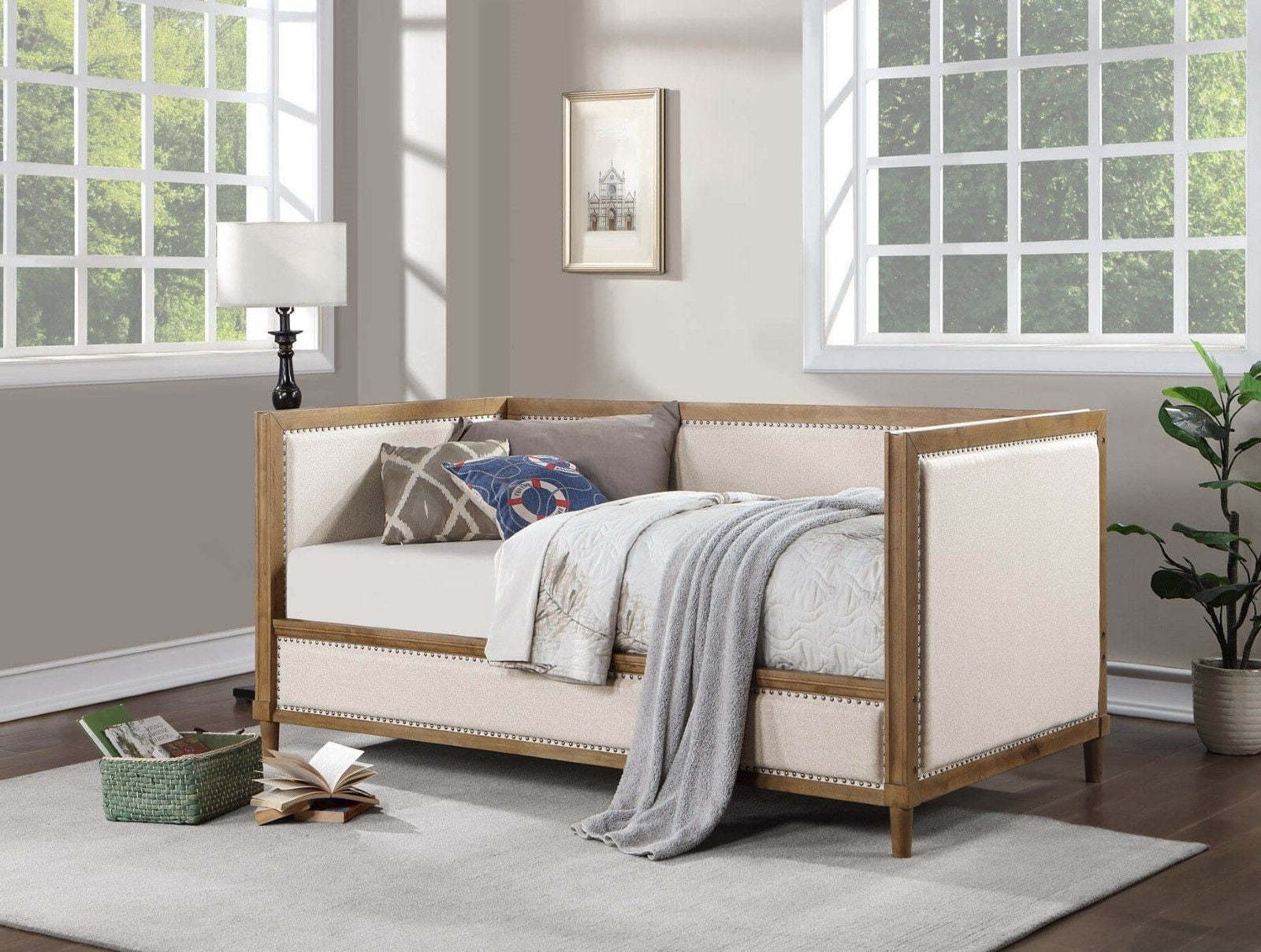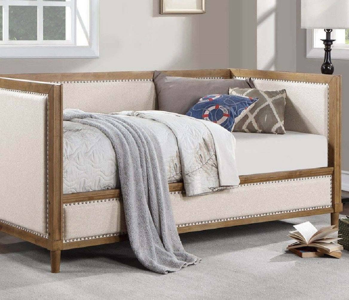Beige Fabric Daybed, Twin Size, Nailhead Trim, Light Oak Frame
