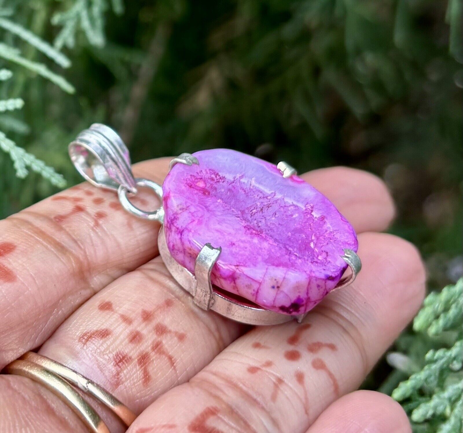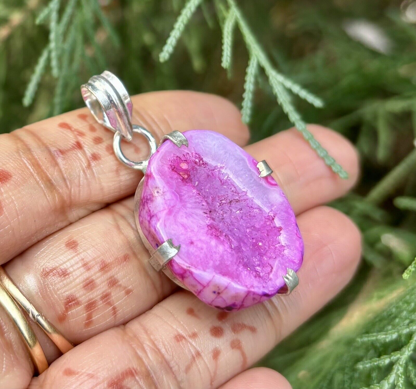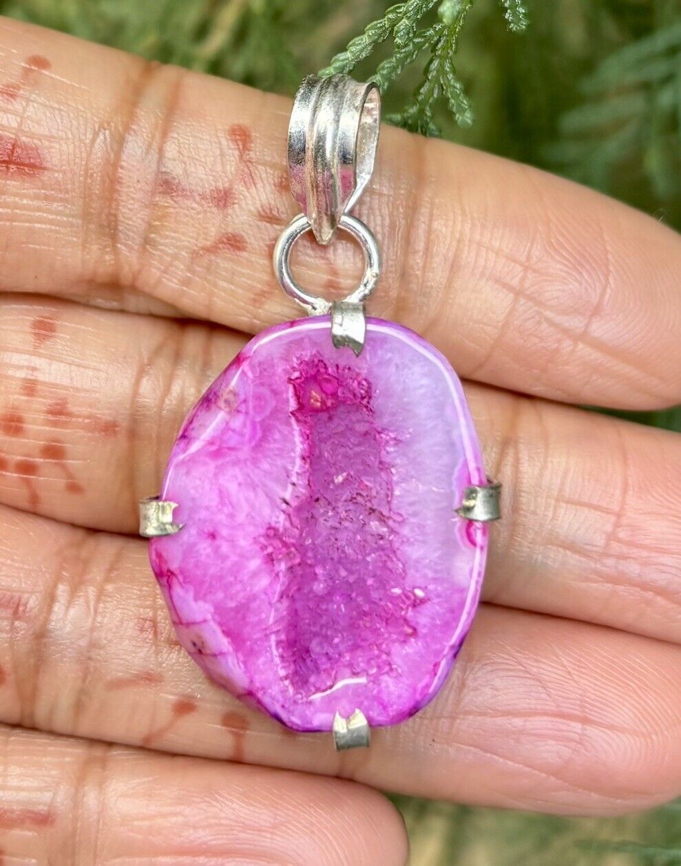 Pendentif en pierre agate géode druzy rose plaqué argent sterling 925,...