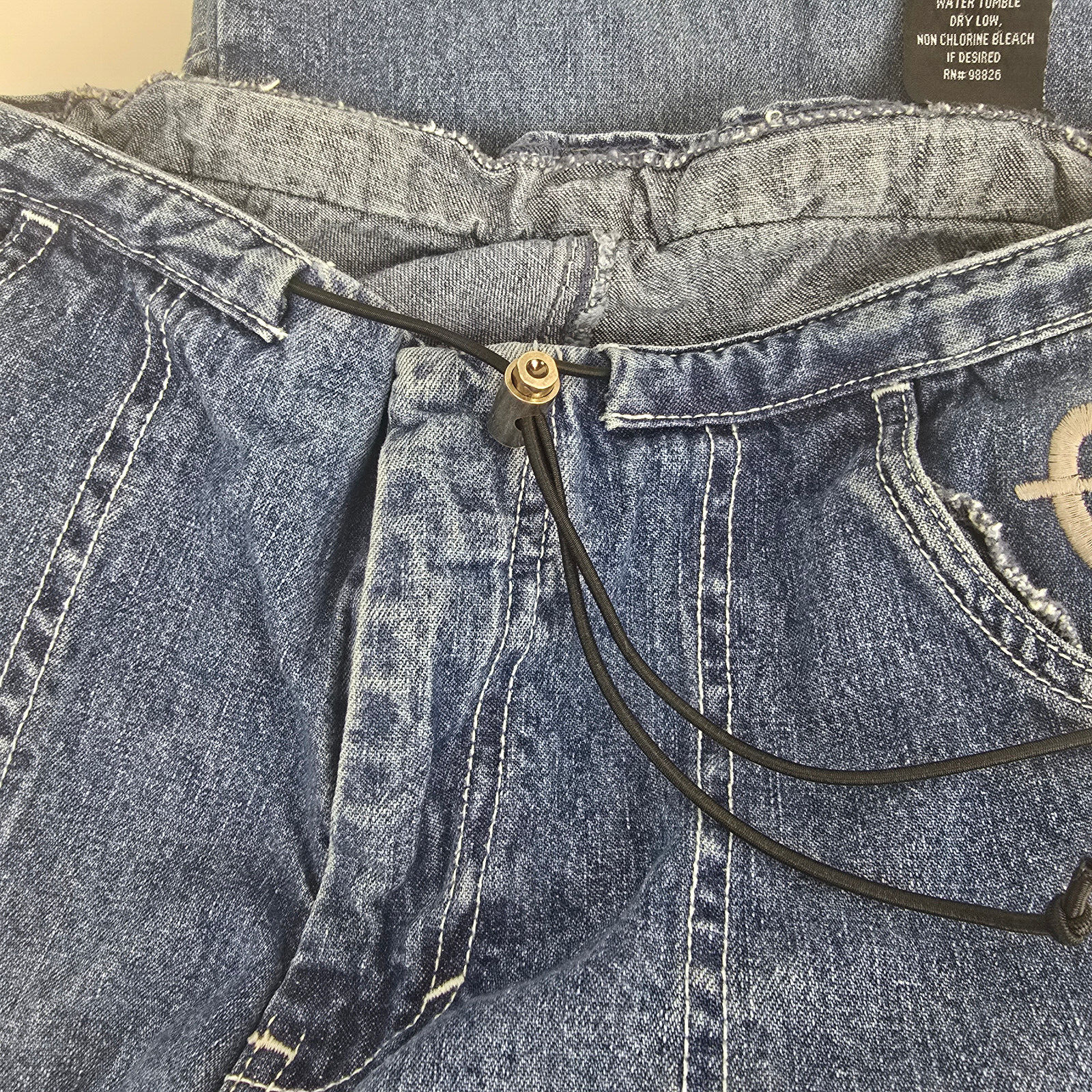 No rips, stains or holes. Smoke-free home. FLAW : easy fix - there is a hidden button closure inside waistband, button came off and was lost, needs super simple sewing repair to add on a small button, though with zipper and toggle they do stay on anyway.