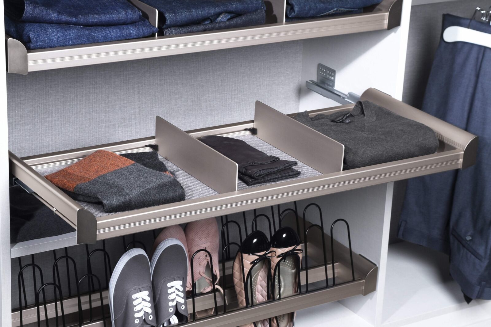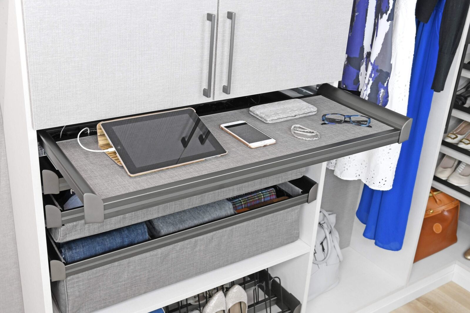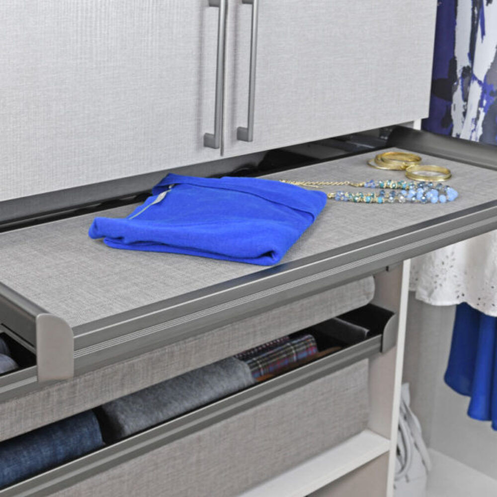 Transform your closet into a haven of organization and style with our pull-out configuration designed specifically for folding pants, shirts, and sweaters. This innovative solution offers convenience and efficiency, ensuring that your clothing items are neatly folded and easily accessible whenever you need them. Our pull-out configuration provides a tailored solution for folding pants, shirts, and sweaters, enhancing the functionality of your closet space and making daily tasks more streamlined and efficient. Experience a clutter-free environment with our pull-out system, which tucks neatly under a fixed shelf, maximizing the use of vertical space and keeping your closet area tidy and organized. Customize the look of your pull-out configuration by adding a drawer face with the Drawer Face Adapters, allowing you to seamlessly match it with the closet panels and create a cohesive and integrated storage solution. Choose between Slate or Beach fabric options to pair with any of the available finishes, ensuring that your pull-out configuration complements your existing decor and enhances the overall aesthetic of your closet. Enjoy the flexibility of our pull-out system, which can be easily customized to suit your storage needs and preferences, providing a versatile solution for organizing clothing items of various sizes and types. Elevate the functionality and style of your closet space with our pull-out configuration, which offers a seamless blend of practicality and aesthetics, enhancing both the efficiency and visual appeal of your storage solutions. Our pull-out configuration offers versatility in design, allowing you to personalize your space according to your preferences and style.