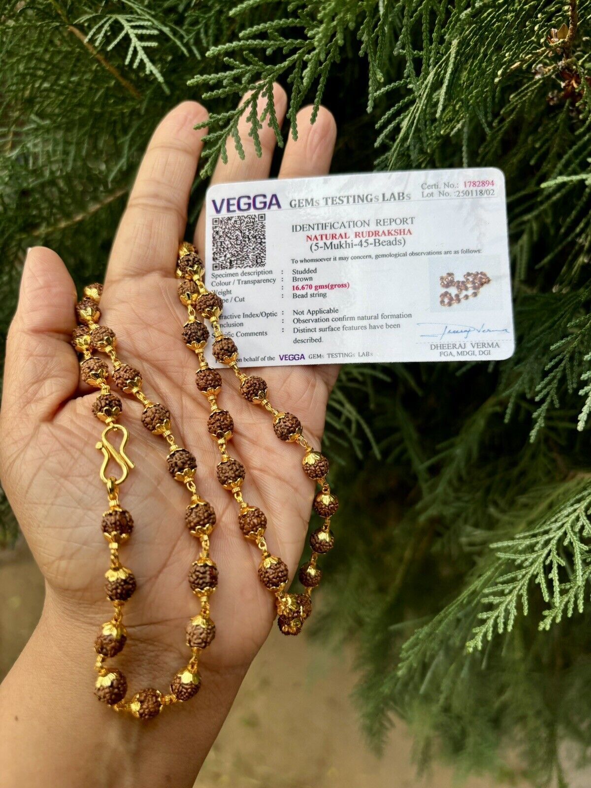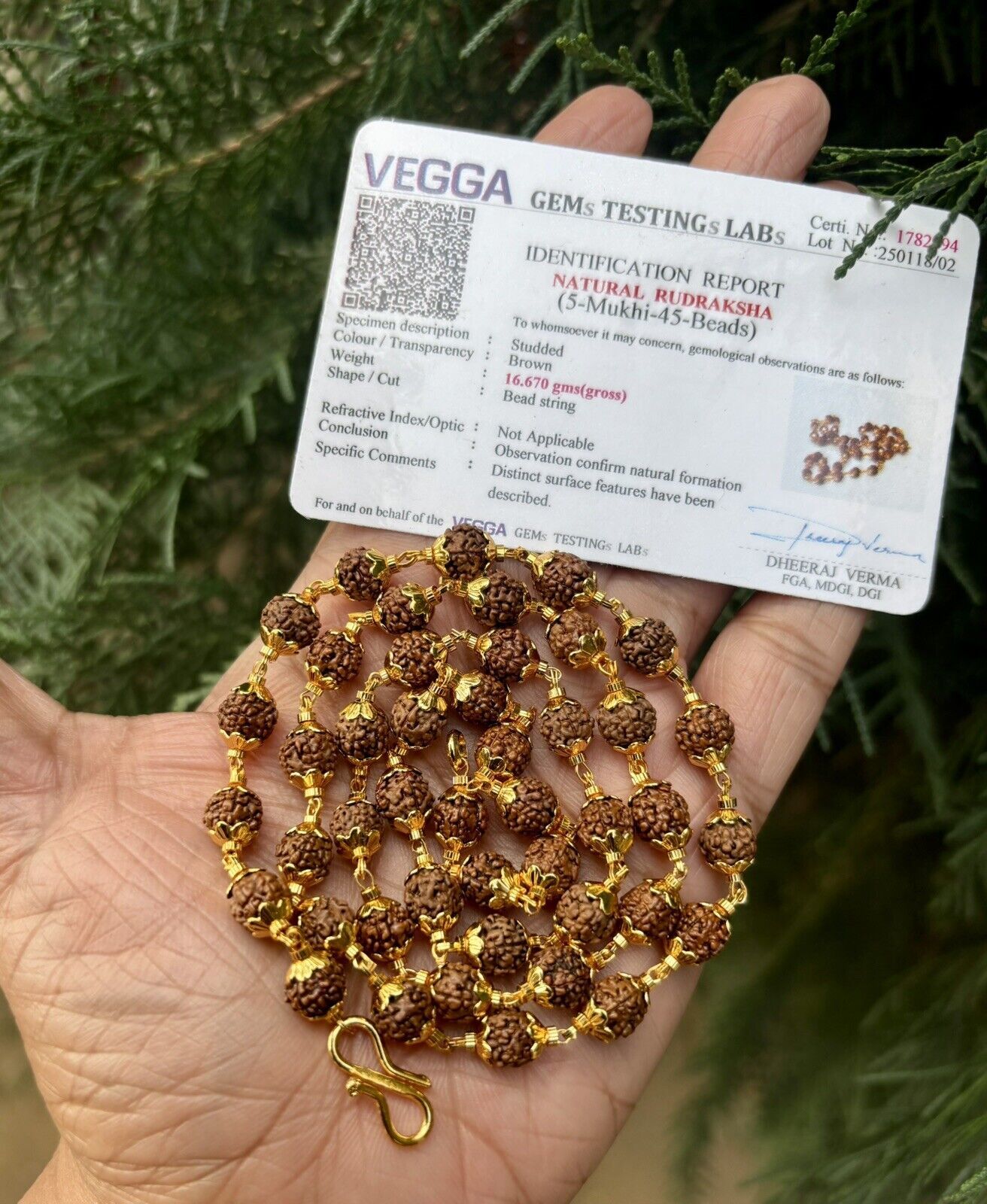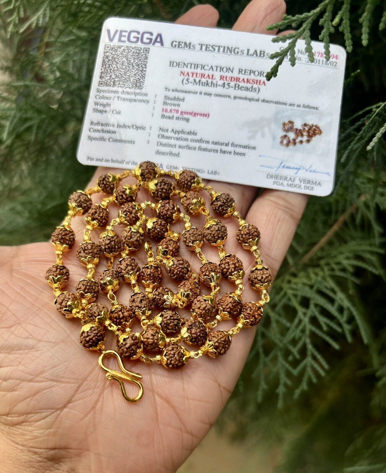 Placcato oro su ottone ottone + LAB CERTIFICATE 44+1 Guru Bead Origine Indiana Rudraksha Mala 5 mukhi 5 facce Lord Shivas Rosario Jaap Mala Yoga Preghiera Meditazione Guarigione