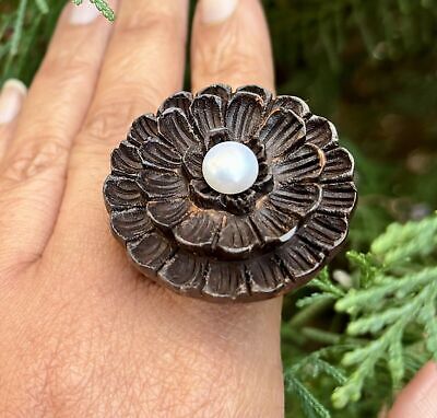 Anello in legno con fiore intagliato, gioielli da cocktail artigianali intagliati a mano