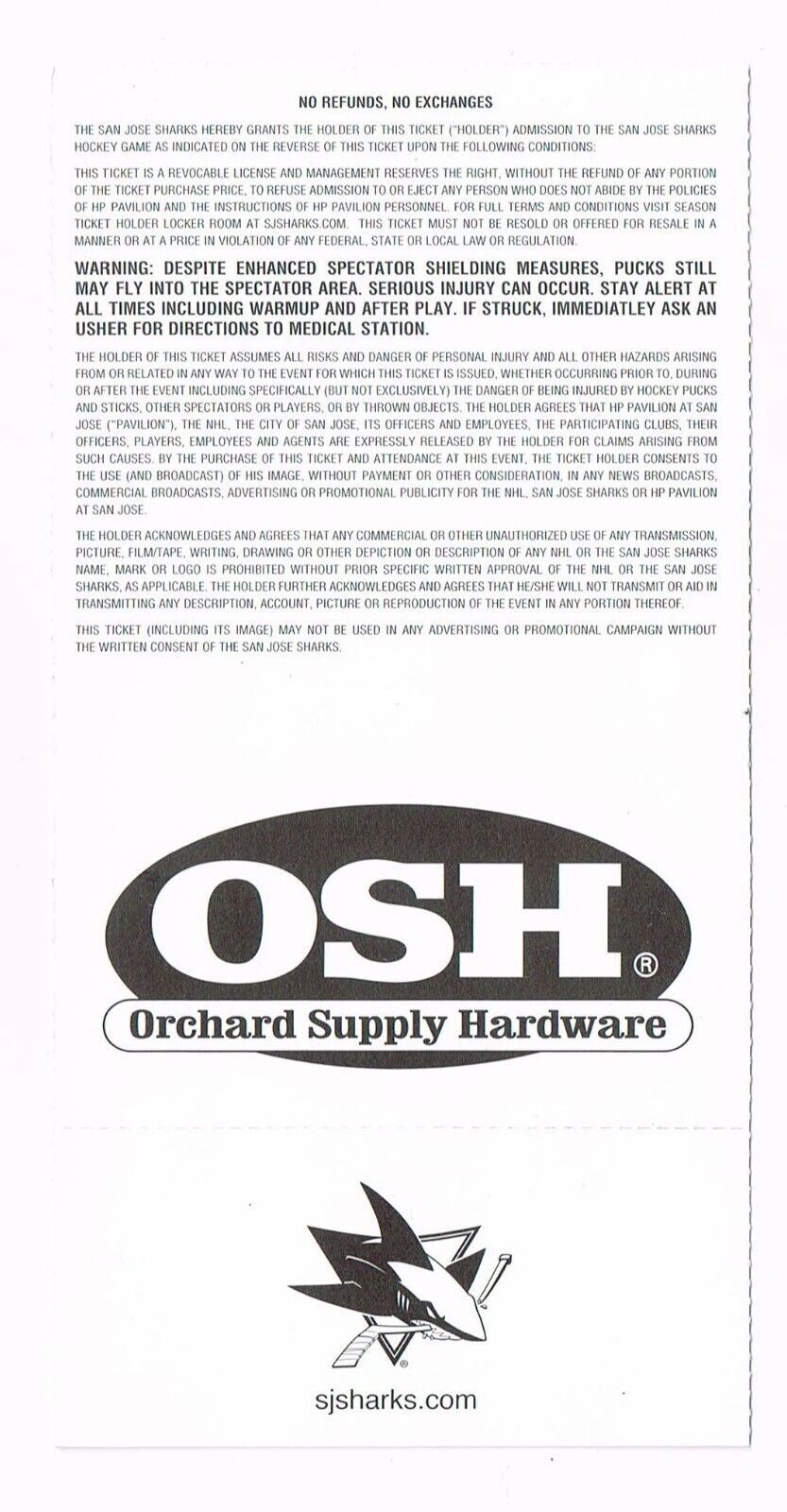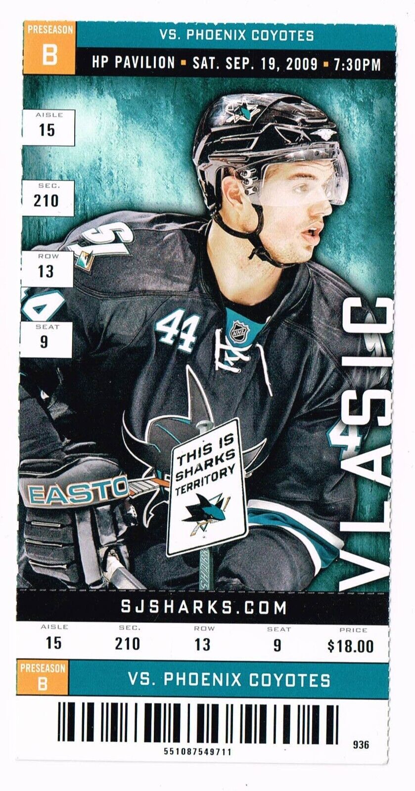 2009 San Jose Sharks Preseason Game B Ticket Phoenix coyotes Sept 19th