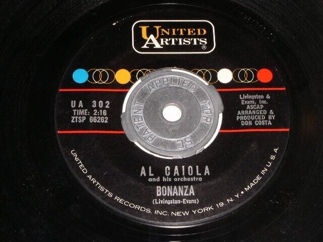 Al Caiola Bonanza Bounty Hunter 45 RPM Record United Artists 302 VG+/VG++