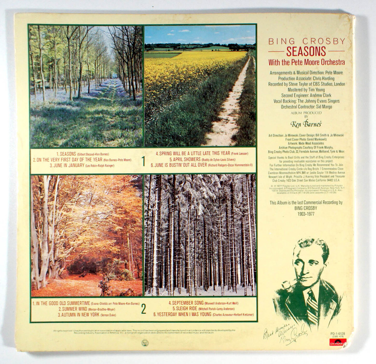 Seasons, by Bing Crosby, is particularly significant in that it was the final studio album completed before Crosby's death on October 14, 1977; it was released posthumously, and was marketed with the tagline The Closing Chapter. Crosby was backed by Pete Moore and his Orchestra and the Johnny Evans Singers. Moore also did all the arrangements for the album, which was recorded at CBS Studios, Whitfield Street, London on September 12,13 14 1977 - except for one song Spring Will Be a Little Late This Year which was recorded at United Western Recorders, Sunset Boulevard, Hollywood on January 19, 1976. This song was also produced by Ken Barnes and arranged by Pete Moore. The album entered the UK album charts in December 1977 and remained there for seven weeks with a peak position of No. 25. Variety commented: "If it were merely that this is the last recording Bing Crosby ever made, it would be more than enough reason to run and buy it. But it also happens to be a marvelous representation of the later Crosby years." Billboard reviewed it and said: "This album is billed as the last commercial recording by the beloved crooner, who died one month after recording these tracks. This is a concept album in that it contains 12 songs which either deal with a specific time of the year or more generally on the passing of time. Excellent mix of rousing sing-along numbers like June Is Bustin Out All Over and Sleigh Ride (which feature some high-stepping female background singers) with more sophisticated, elusive melodies like Autumn in New York."