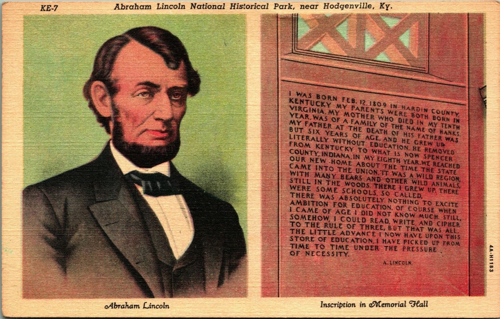 Lincoln Inscription in Memorial Hall Hodgenville KY Vtg Linen Postcard