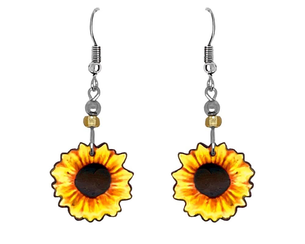 Sunflower acrylic dangle earrings with beaded metal hooks. |