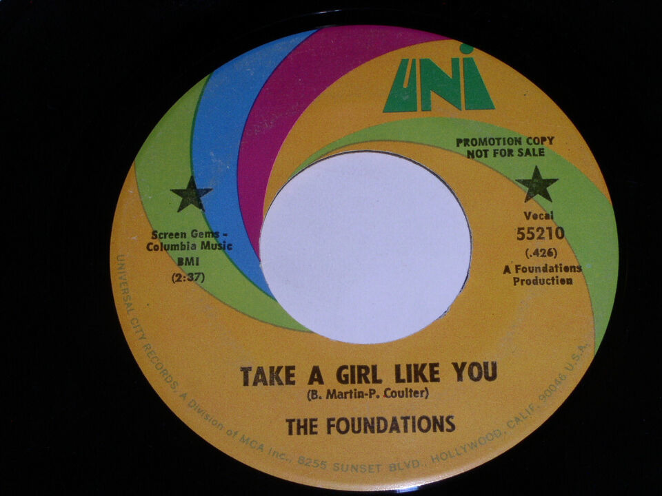 This is a vintage promotional 45 rpm phonograph record by The Foundations, entitled, "Take A Girl Like You". Flipside: "I'm Gonna Be A Rich Man". Record label UNI 55210.
