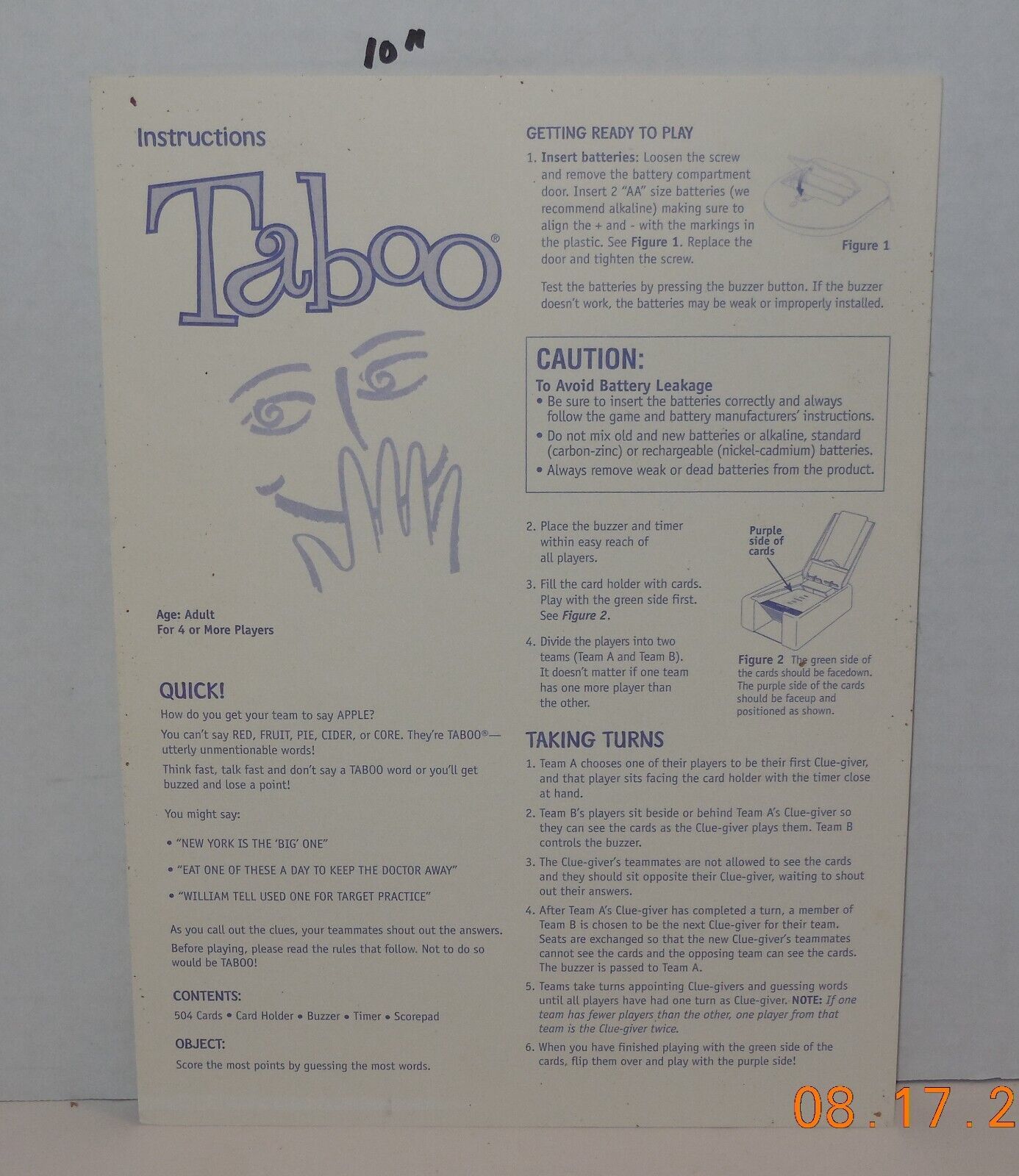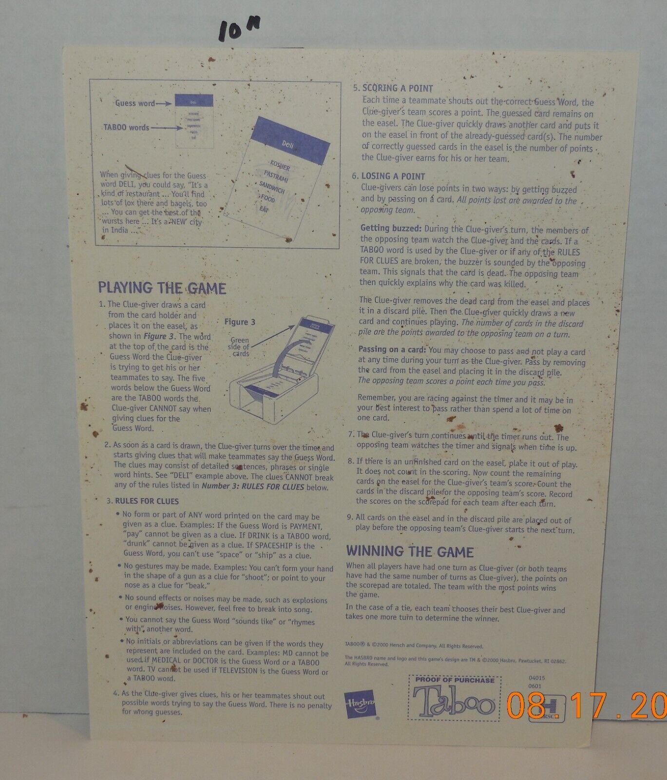 For Sale is a 2000 Hasbro Taboo Board game Replacement Instructions Piece Part. This is for the Instructions ONLY for replacement or to complete your incomplete Game. it in good Used condition as seen in the pictures provided what you see is what you will receive THIS Listing is for the Game Board ONLY as a replacement for your original Game Board. Please ask Any and All Questions prior to purchasing. Fast Same or Next day shipping with Free Delivery Confirmation within the U.S. Payment Due within 7 days of purchase (if you need more time please let us know In advance) we love to combine shipping is always a Yes and Most of the time Additional Items Ship for free.