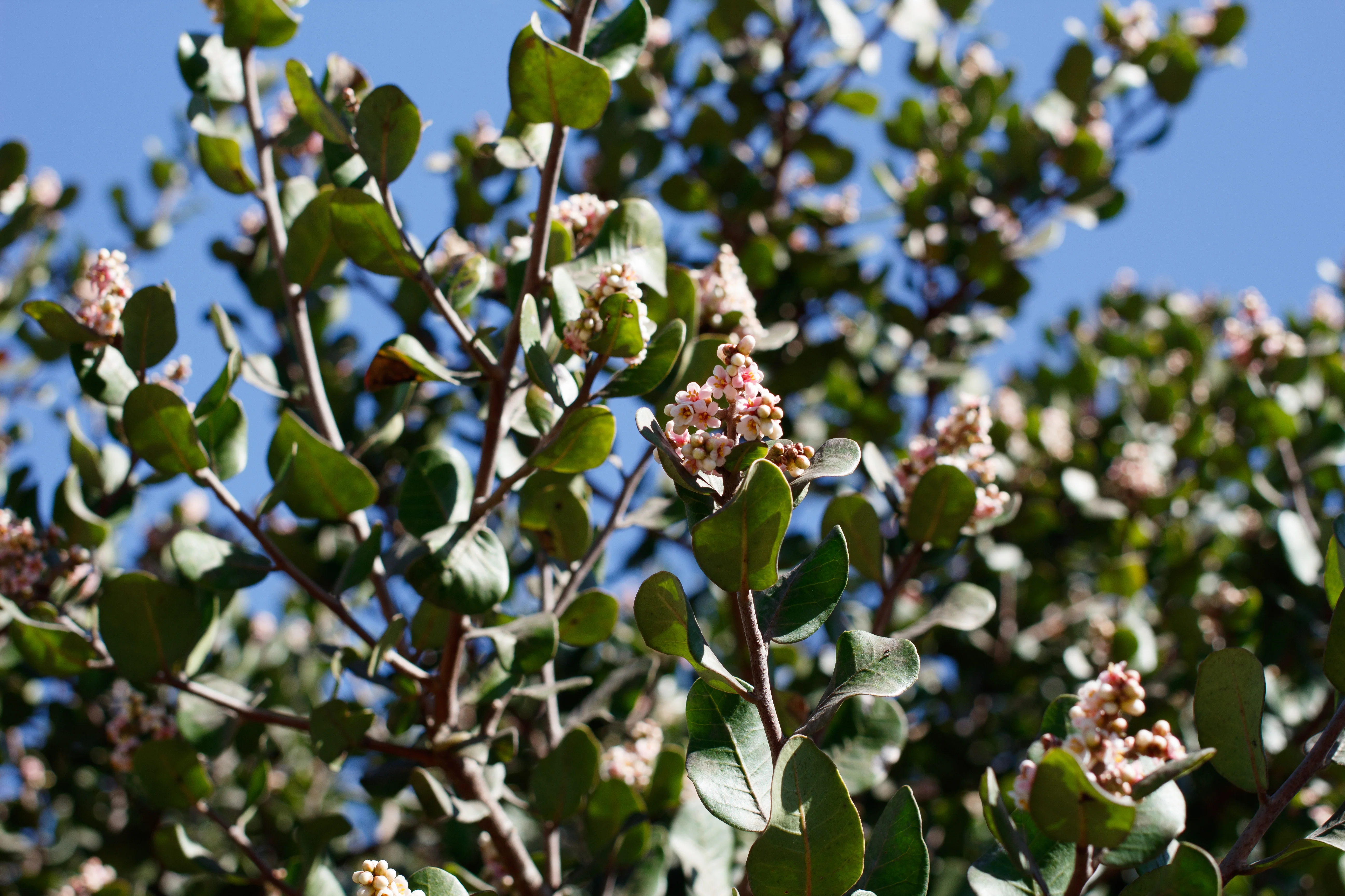 Lemonade Berry (Rhus integrifolia) is a stunning, resilient shrub or small tree that thrives in various environments. Its form varies depending on location—growing as a dense, mounding shrub along the coast and more tree-like further inland.