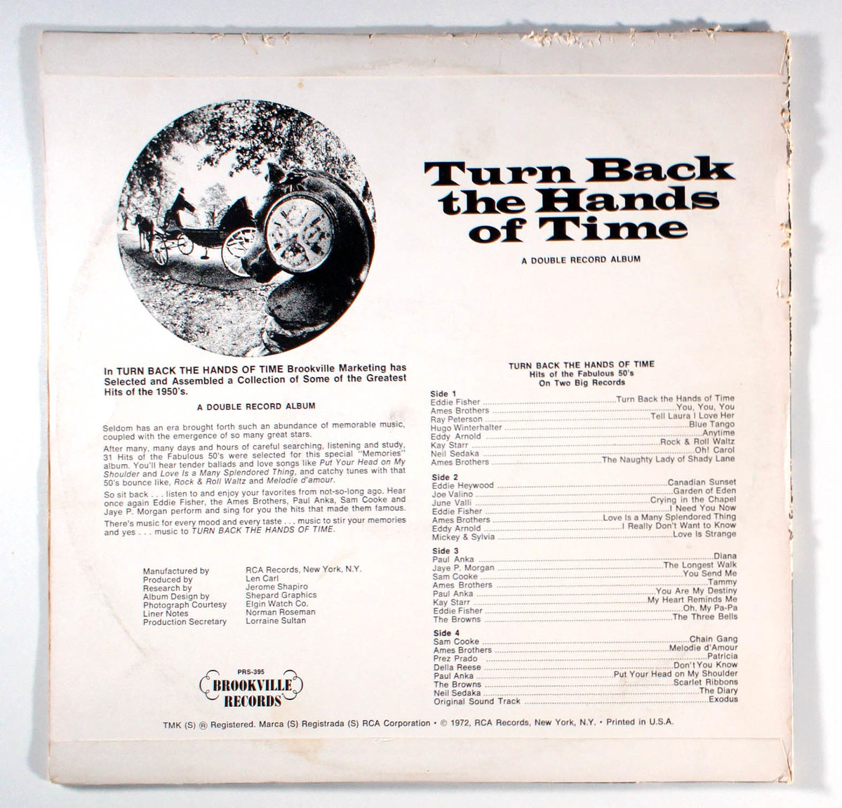 Turn Back the Hands of Time is a double record of selections from the 50s. "Seldom has an era brought forth such an abundance of memorable music,coupled with the emergence of so many great stars. After many, many days and hours of careful searching, listening and study, 31 Hits of the Fabulous 50's were selected for this special 'Memories' album. You'll hear tender ballads and love songs like Put Your Head on My Shoulder and Love is a Many Splendored Thing, and catchy tunes with that 50's bounce like, Rock Roll Waltz and Melodie d'amour. So sit back...listen to and enjoy your favorites from not-so-long ago. Hear once again Eddie Fisher, the Ames Brothers, Paul Anka, Sam Cooke and Jaye P. Morgan perform and sing for you the hits that made them famous. There's music for every mood and every taste...music to stir your memories and yes...music to Turn Back the Hands of Time.