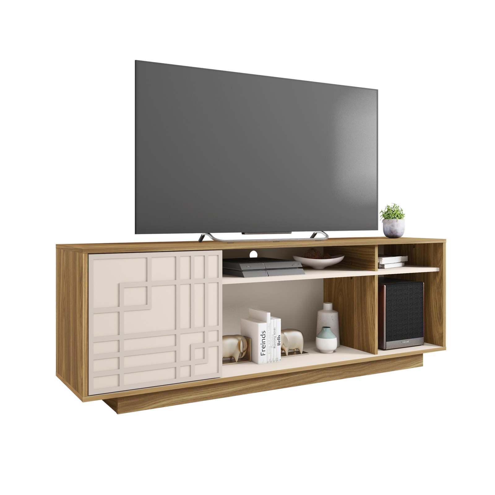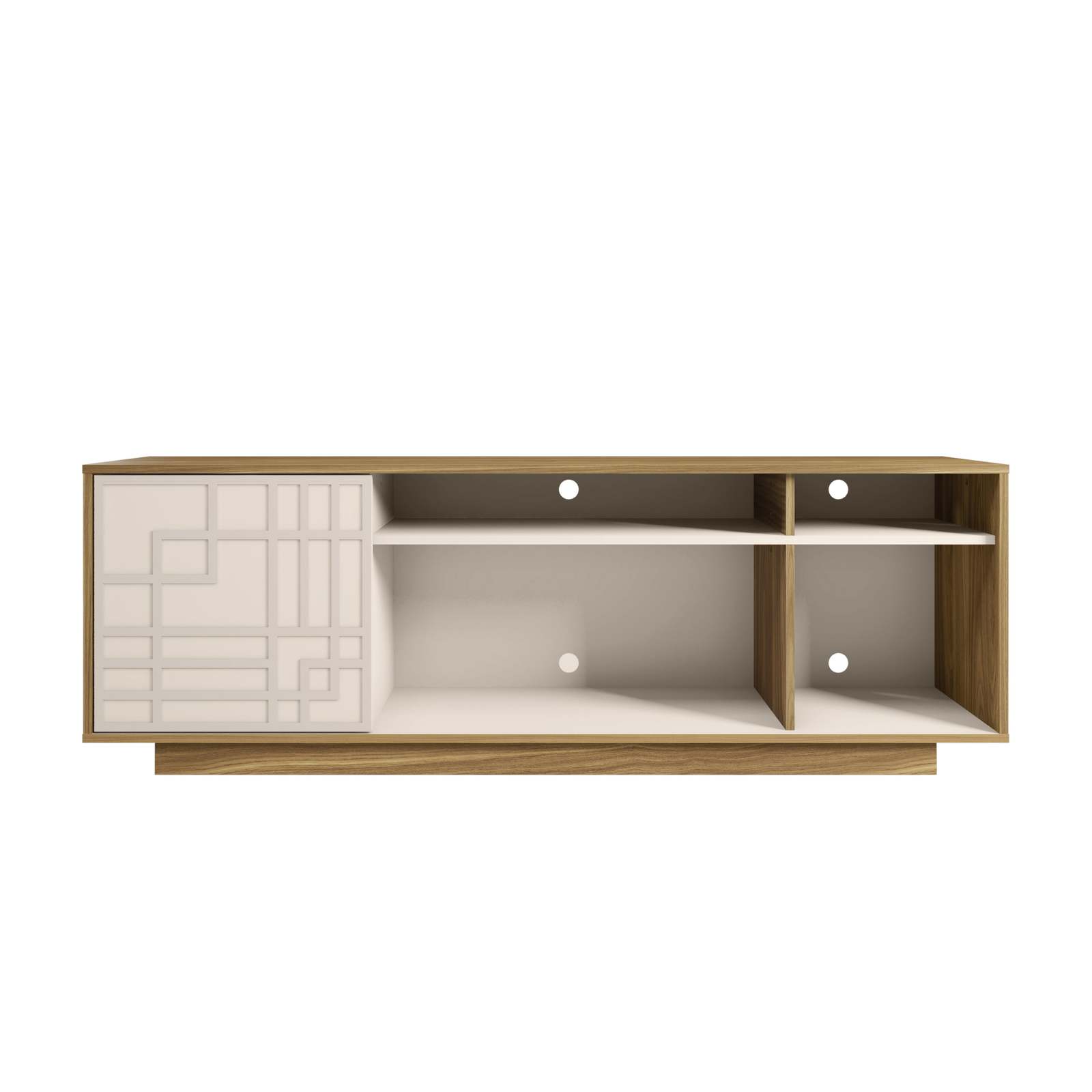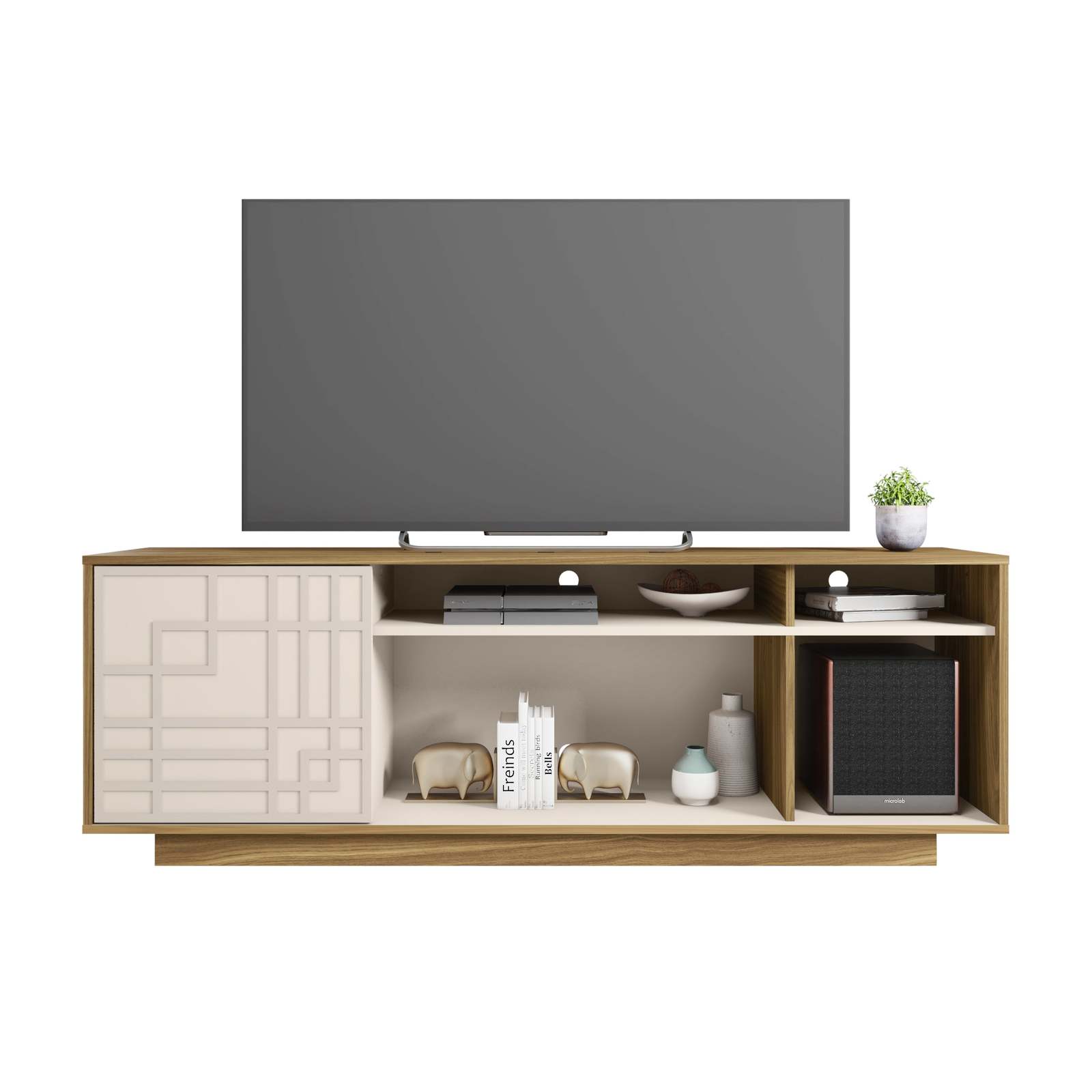 Embodying a contemporary design this tv stand brings warmth to any living space. Its oak natural wood color and beautiful patterned door will stand out in any room. Behind the patterned door lies a large, concealed storage space, while open shelving provides ample space for decor or any easy to access electronics. The base features a floating effect that adds a touch of modernity to the entertainment center. This TV Stand can hold TVs up to 70in diagonally. The unit is 63in wide but an overhang on either side is acceptable.