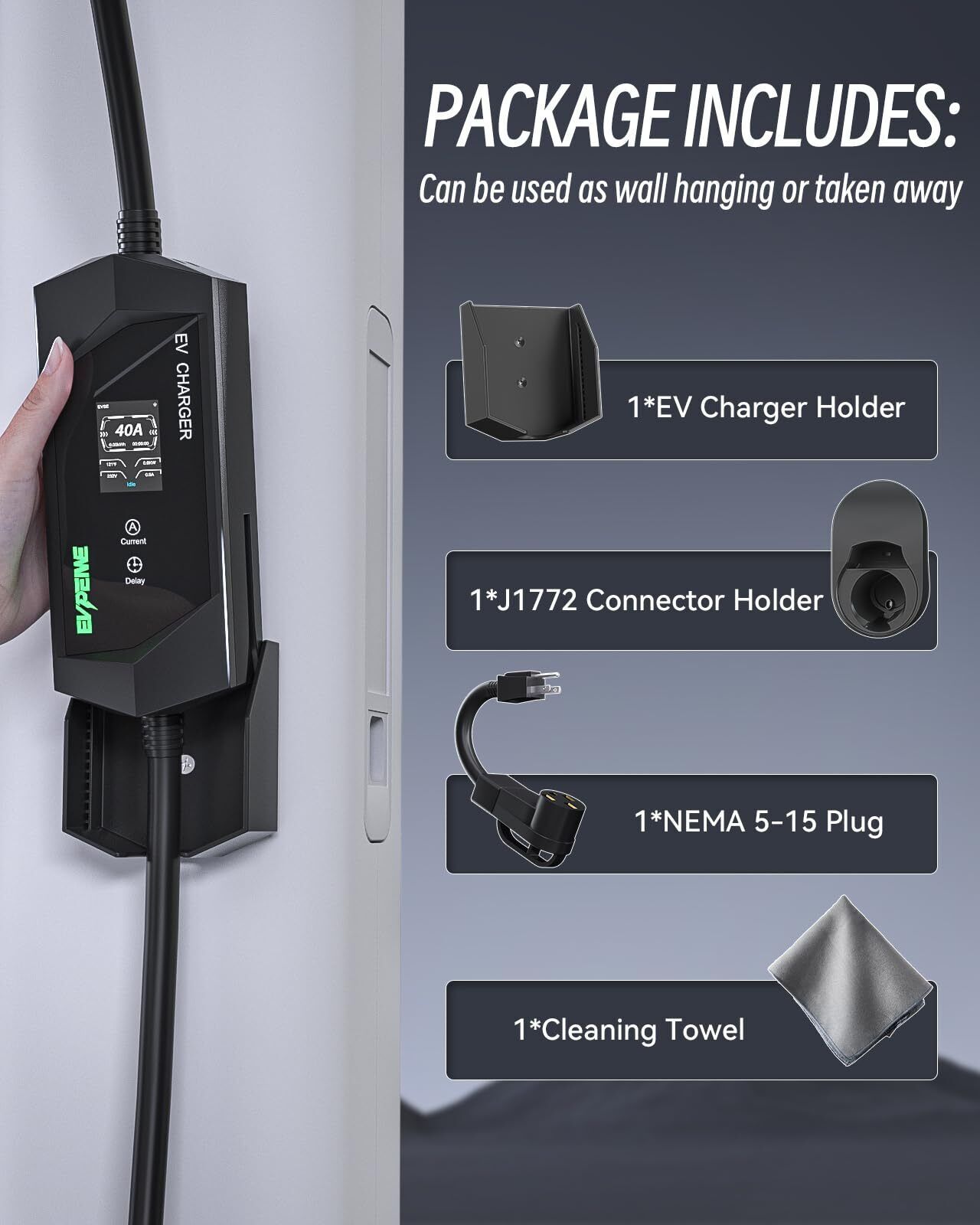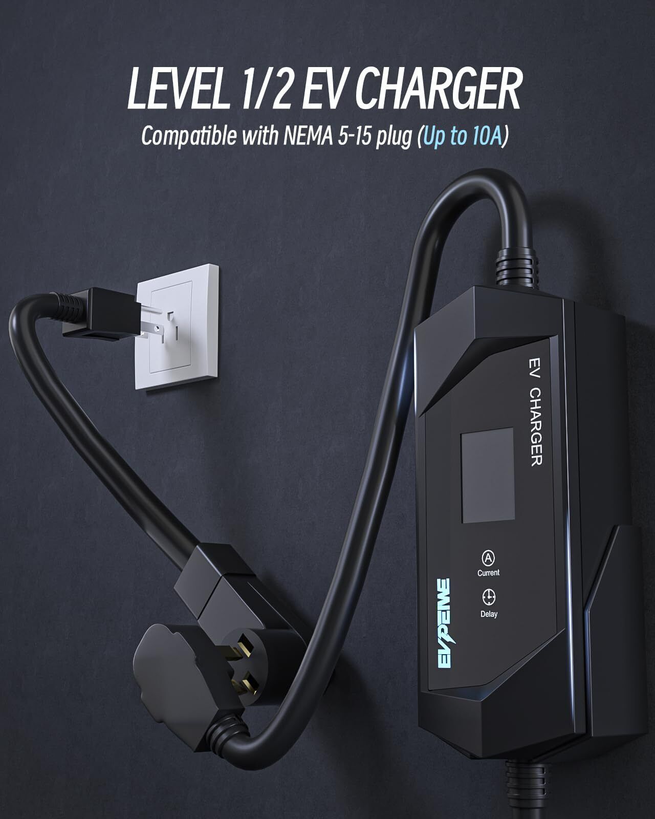 Level 1 Level 2 Charging Options: Designed for versatile charging, this portable EV charger supports both Level 1 (110V) and Level 2 (240V) modes. Equipped with a NEMA 14-50 plug and a NEMA 5-15 adapter, it seamlessly adapts to standard outlets or dedicated EV charging stations, offering convenient and flexible charging options wherever you are. Please dial down to 15 amps when using the NEMA 5-15P. Rapid Charging Performance: The EVPEIWE Level 2 EV charger delivers a powerful 240V, 40A output, providing up to 9.6kW of charging power. This enables charging speeds up to 4 times faster than standard Level 1 chargers, significantly reducing the time needed to recharge your electric vehicle and getting you back on the road quicker. Advanced Charging Protection: This Level 1/2 EV charger offers protection against over-voltage, under-voltage, overheating, overcharging, and overcurrent. With built-in lightning protection, grounding safeguards, and automatic shutoff when charging is complete, it?s also rated IP65 waterproof and dustproof, ensuring reliable use in tough conditions from -31?~+122?. Dynamic LCD Display with Customizable Settings: The clear and easy-to-read LCD screen displays key charging metrics like current, voltage, efficiency, and a countdown charging time. You can adjust the current(6A/8/10/13/16/20/24/32/40A). EVPEIWE electric vehicle ev charger supports delayed charging for 1 to 12 hours, automatically initiating and stopping charging. This enables cost-effective charging during off-peak hours. Long Lasting Design Extended 25ft Cable: Drawing inspiration from the rugged and futuristic design of the CT, this ev charger features a robust UL-listed 25ft cable, offering maximum flexibility for charging at various distances. Built to endure, its sleek, modern aesthetics complement its high functionality. The package includes a storage bag, a cable holder, and a user manual, ensuring convenience and organization with every use.