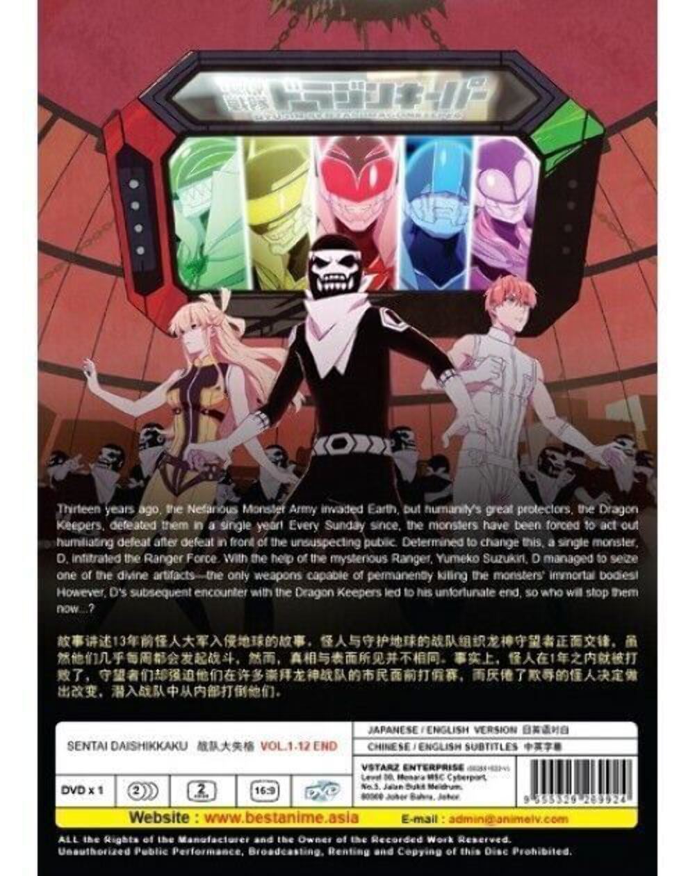 For detail of this set please view below only, and also to tell if this set has english or Japanese audio view below and check out the listing photo back side. If it shows as (Japanese / English Version means it has English audio but if it only shows Japanese Version no English Audio) All our set has at less English Subtitles if only Japanese audio. This set is all regions. SENTAI DAISHIKKAKU VOL.1-12 END DVD Title Name SENTAI DAISHIKKAKU VOL.1-12 END No of Disc 1 Disc (12 Episodes) Version English / Japanese Subtitles Chinese / English Format DVD / NTSC All Region Code (16:9) STORY : Thirteen years ago, the Nefarious Monster Army invaded Earth, but humanity's great protectors, the Dragon Keepers, defeated them in a single year! Every Sunday since, the monsters have been forced to act out humiliating defeat after defeat in front of the unsuspecting public. Determined to change this, a single monster, D, infiltrated the Ranger Force. With the help of the mysterious Ranger, Yumeko Suzukiri, D managed to seize one of the divine artifacts?the only weapons capable of permanently killing the monsters' immortal bodies! However, D's subsequent encounter with the Dragon Keepers led to his unfortunate end, so who will stop them now...? We Only Sell Original/Genuine DVDs. All DVDs I'm selling are from Licensed Publisher in Malaysia. All DVDs come with Original Sealed Authenticated Sticker / Hologram by Malaysia Censorship Board. ALL PACKAGE WILL BE SHIP OUT FROM USA CA SAN DIEGO AREA OCEANSIDE, SAN MARCOS. THIS MEAN WITH IN USA YOU SHOULD RECEIVE THE PACKAGE WITH IN 4-6 BUSINESS DAY AFTER SHIP OUT. We Only Sell Original/Genuine DVDs. All DVDs I'm selling are from Licensed Publisher in Malaysia. All our products are All region so it will play any dvd player in the world Any problem please contact us first so we can speed up taking care of you.