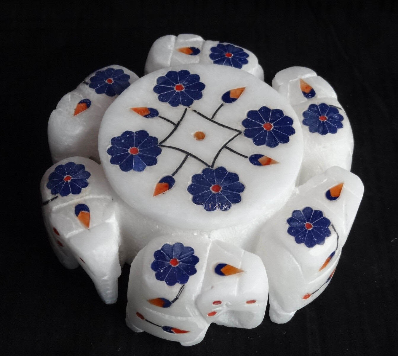 Der Marmor zum Intarsien des Halbedelsteins stammt aus der Stadt Makrana, Rajasthan Indien.