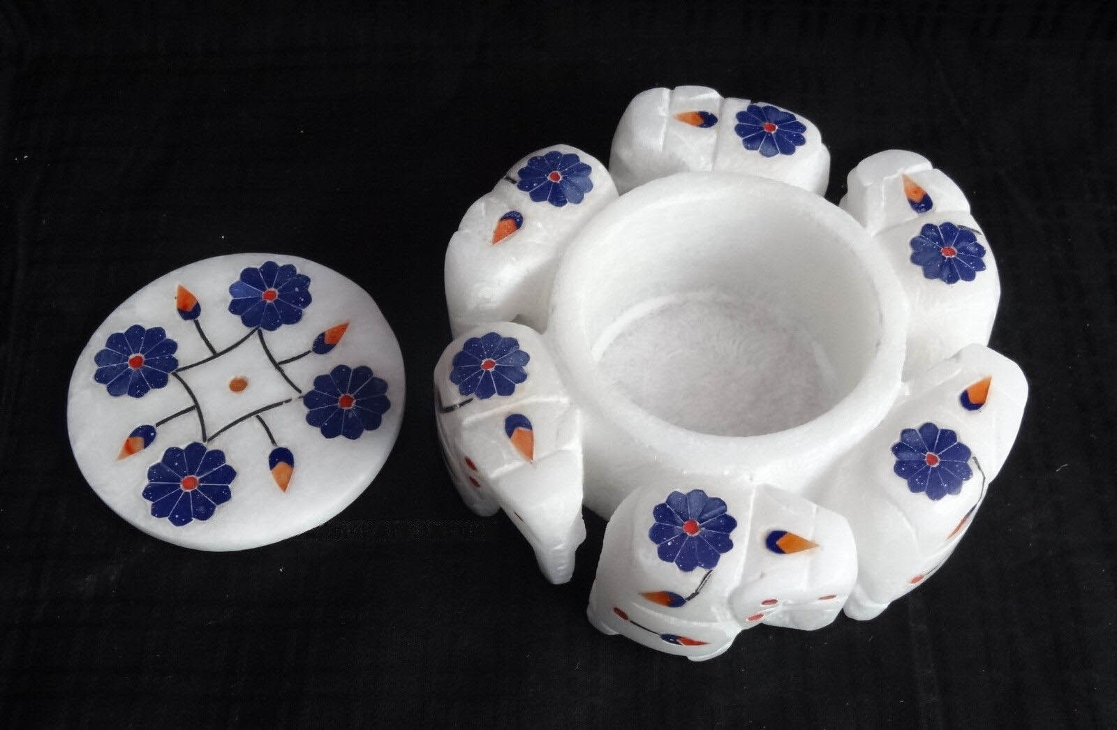 Antike Marmor Schmuckschatulle Lapis Stein 6 Elefanten Intarsien Mosaik Kunst...