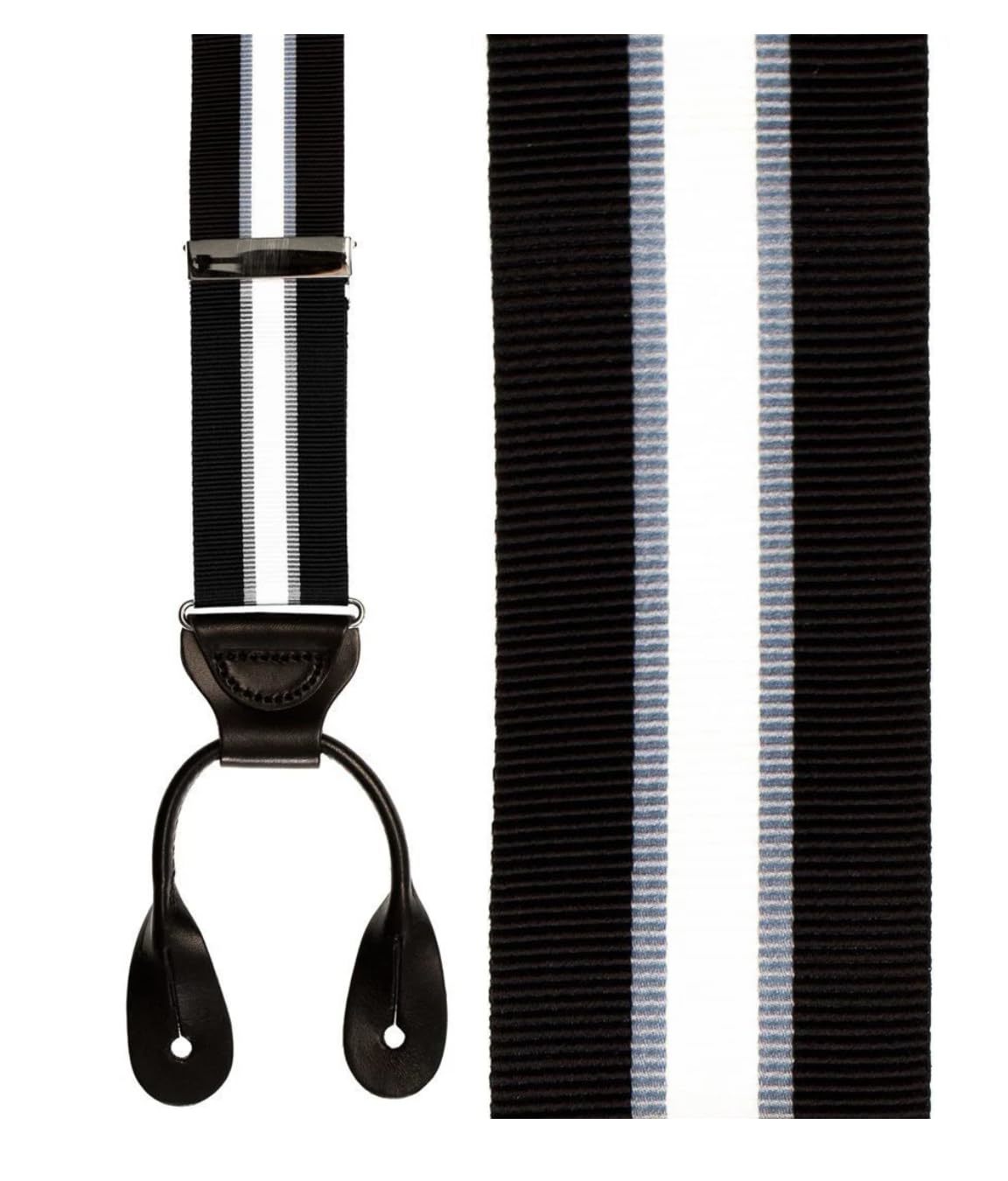 Product description: Add a touch of classic sophistication to your wardrobe with these timeless navy and white striped suspenders. The bold dual-tone design features a crisp white center stripe against a deep navy background, creating an elegant contrast that pairs perfectly with formal and business attire. Crafted with premium materials, these suspenders include durable leather ends and adjustable metal clips for a secure, customized fit. The ribbon material provides both flexibility and strength, while the leather attachments offer reliable support and a refined finish. These versatile suspenders can elevate any outfit, from wedding attire to business suits, making them an essential accessory for the well-dressed gentleman. The adjustable design ensures comfort throughout the day, while the classic striped pattern maintains its distinguished appearance for any occasion.