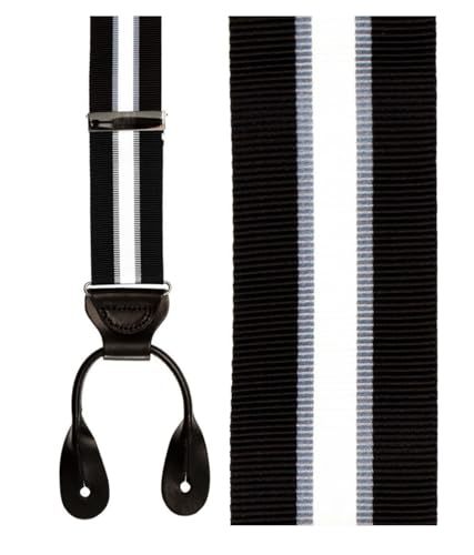 Add a touch of classic sophistication to your wardrobe with these timeless navy and white striped suspenders. The bold dual-tone design features a crisp white center stripe against a deep navy background, creating an elegant contrast that pairs perfectly with formal and business attire. Crafted with premium materials, these suspenders include durable leather ends and adjustable metal clips for a secure, customized fit. The ribbon material provides both flexibility and strength, while the leather attachments offer reliable support and a refined finish. These versatile suspenders can elevate any outfit, from wedding attire to business suits, making them an essential accessory for the well-dressed gentleman. The adjustable design ensures comfort throughout the day, while the classic striped pattern maintains its distinguished appearance for any occasion.