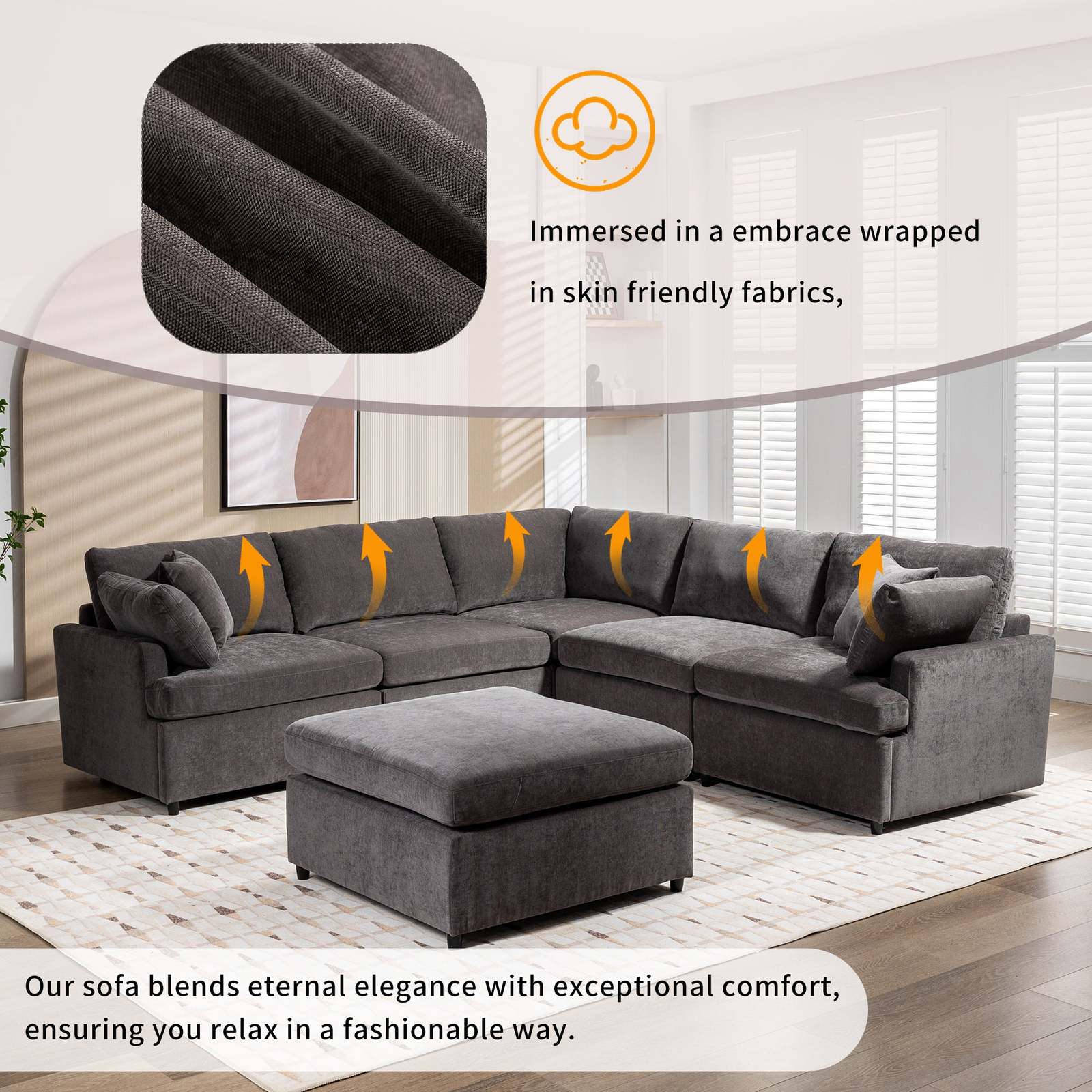 Upholstered Sectional Sofa w/ Ottoman (U-Shape, 6-Seat)