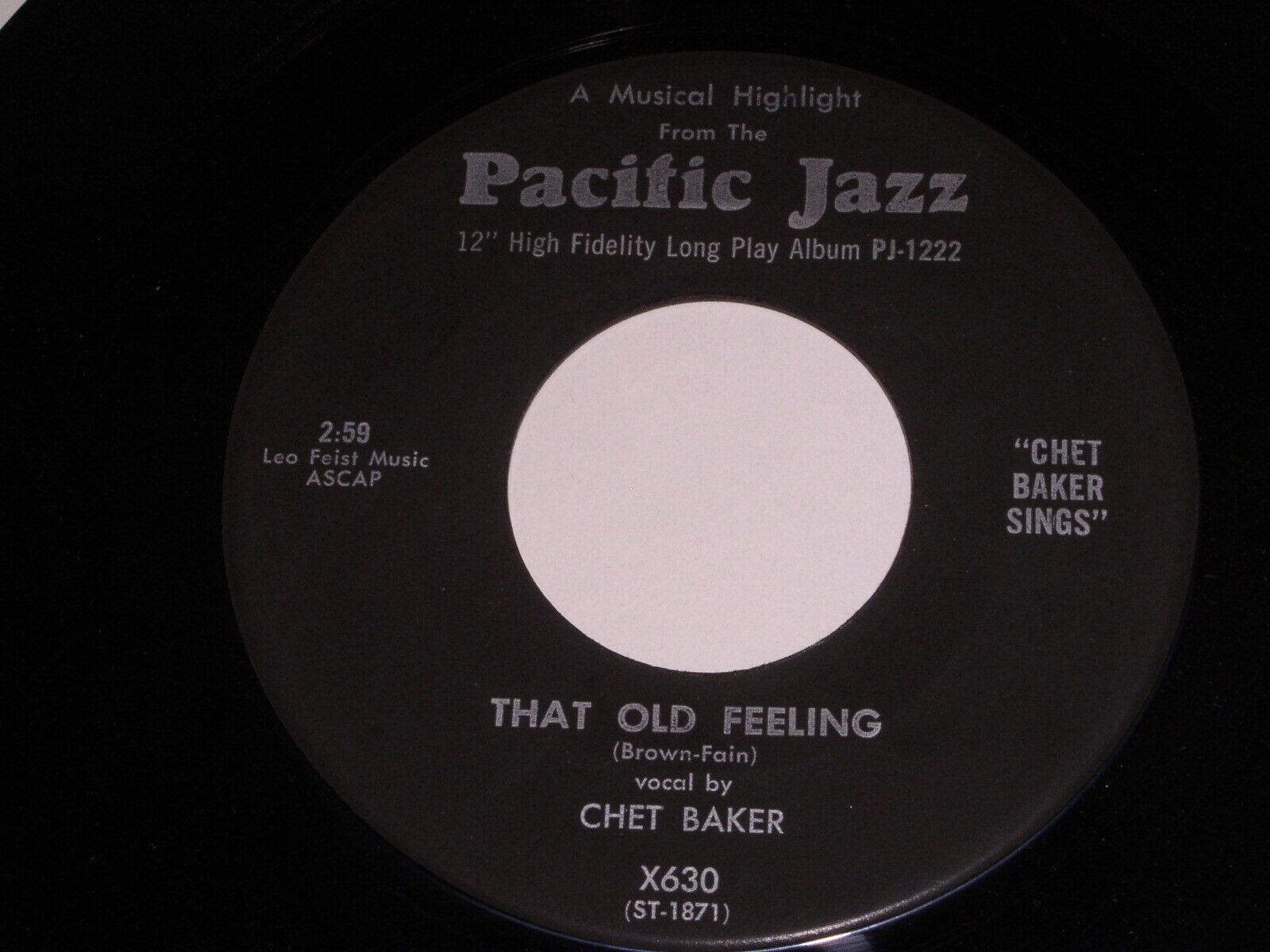 This is a vintage 45 rpm phonograph record by Chet Baker, entitled, "That Old Feeling". Flipside: "My Buddy". Record label: Pacific Jazz X630. This is a "Musical Highlight" label from the Pacific Jazz issue (black label).