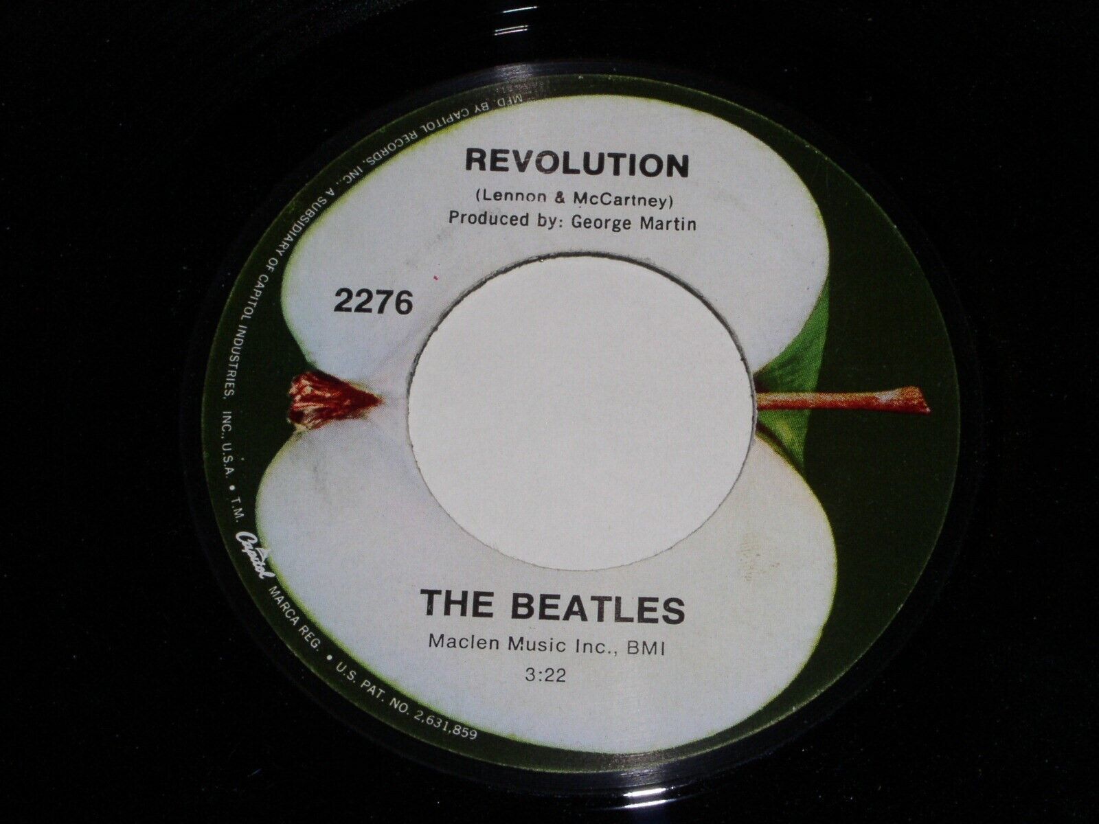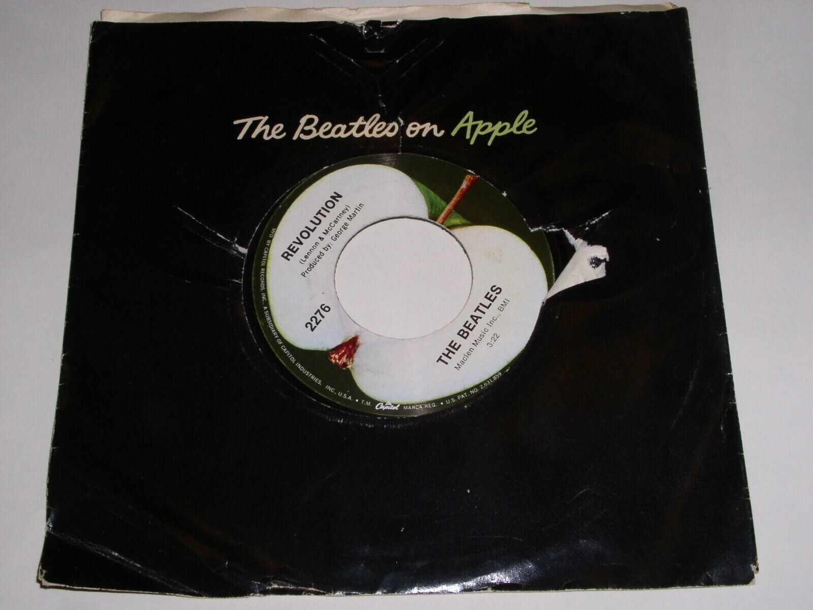 This is an original 45 rpm by The Beatles entitled, ''Hey Jude''. Flipside: "Revolution". Label: Apple 2276. This has the "produced by George Martin" below the title on side 2. Capital Records logo along the left side of label, side 2. Comes with the black Apple paper sleeve as shown, however it has some tearing, wear, creasing and general aging. Number etched in the dead wax: 45-46434-G-10 with an asterisk and number 2.