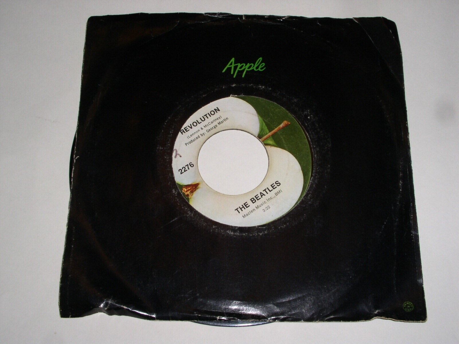 This is an original 45 rpm by The Beatles entitled, ''Hey Jude''. Flipside: "Revolution". Label Apple 2276. I believe this to have the slight "ghosting" on the outside of the label. Photo to show. This has the "produced by George Martin" below the title on side 2. Capital Records logo on the left side of label side 2. Comes with the black Apple paper sleeve as shown, however it has split sides. Number etched in the dead wax: 45-46434-F-7 with an asterisk and number 2.