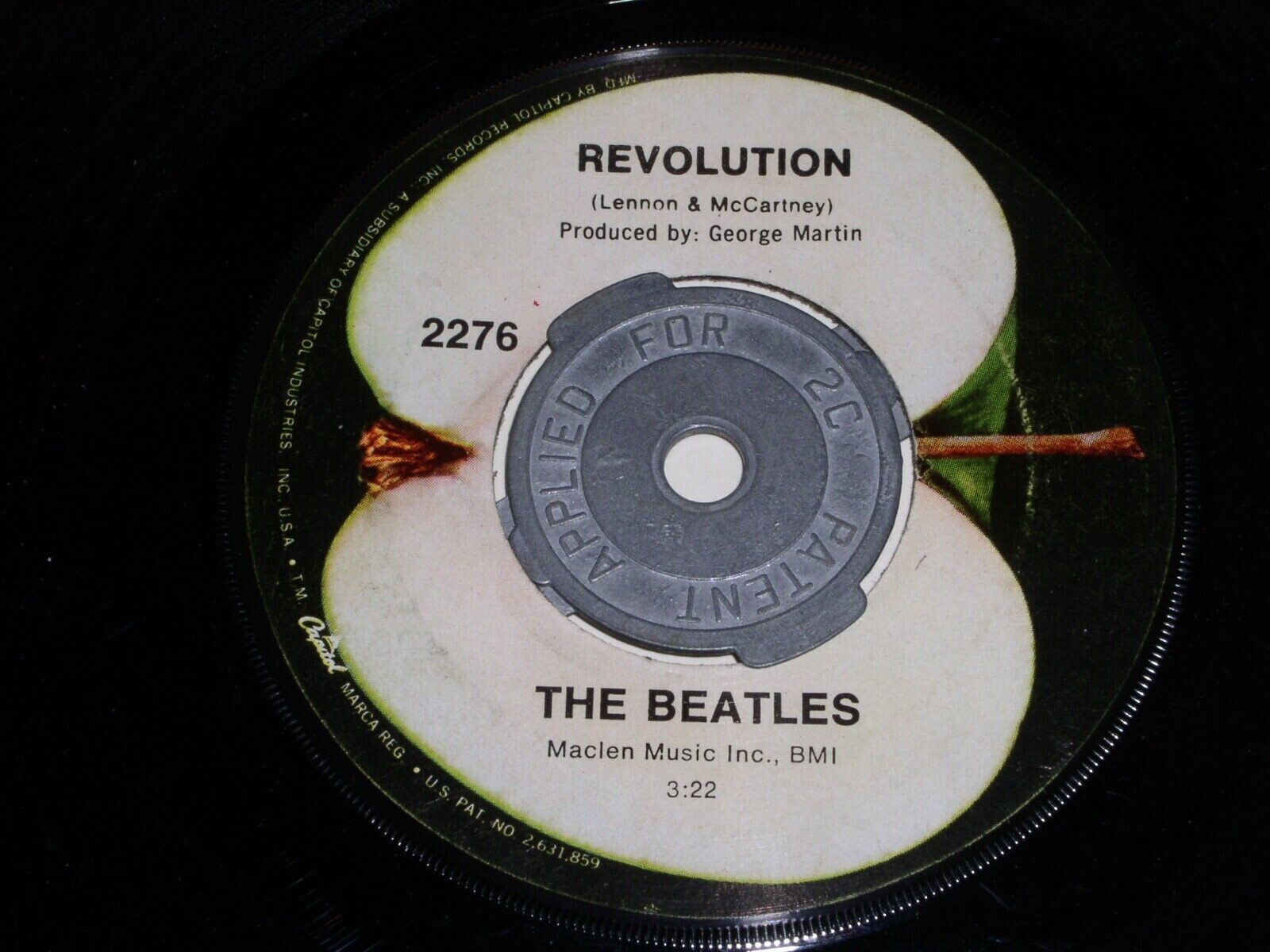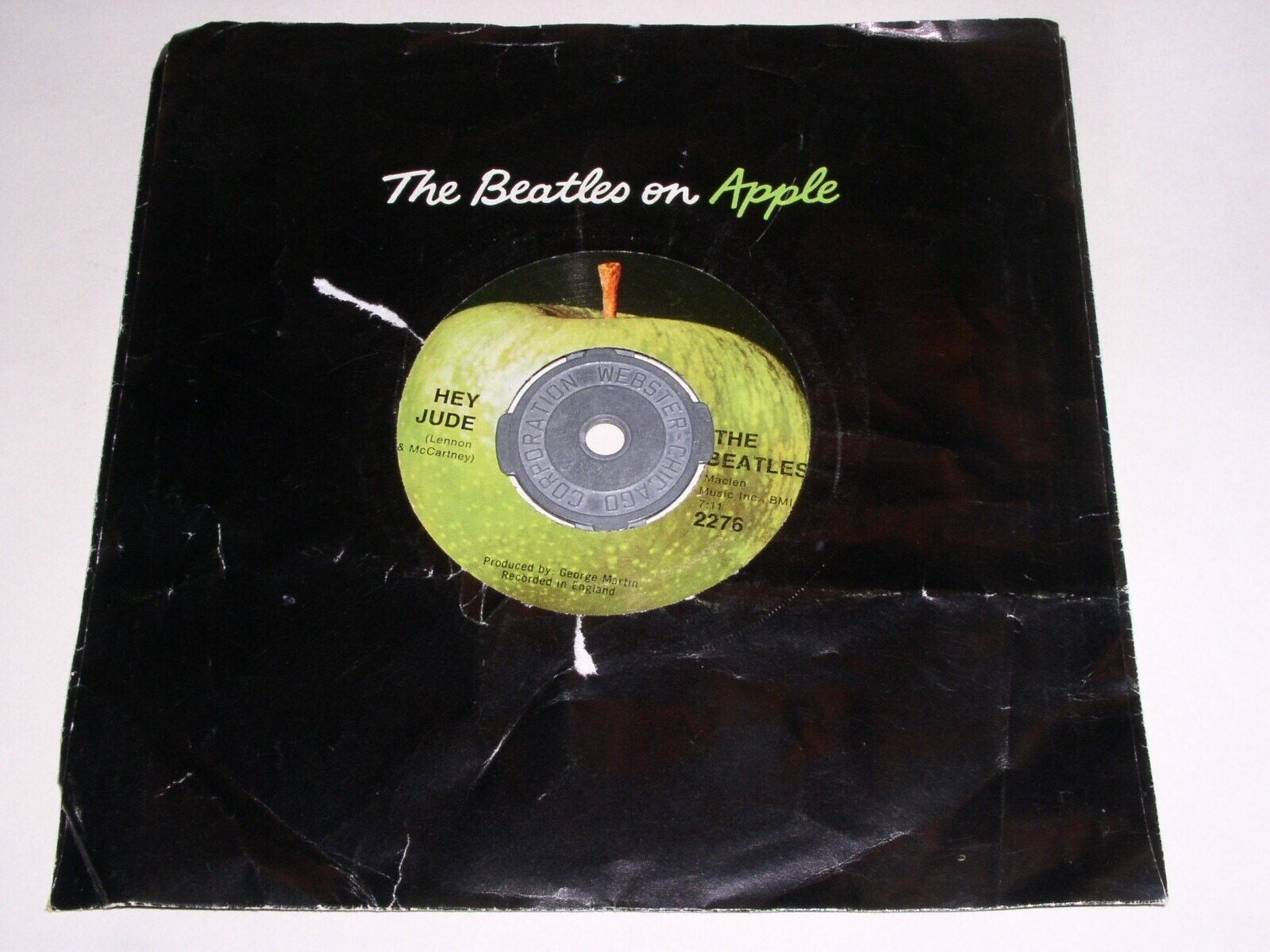 This is an original 45 rpm by The Beatles entitled, ''Hey Jude''. Flipside: "Revolution". Label Apple 2276. A Subsidiary Of Capitol Industries on the outer rim of label. This has the "produced by George Martin" below the title on side 2. Capital Records logo on the left side of label, side 2. This has a metal insert as shown. Comes with the black Apple paper sleeve as shown, however it has some tearing, wear, creasing and general aging. Number etched in the dead wax: 45-46434-F-7 with an asterisk and number 2.