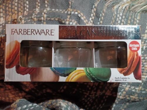 New FARBERWARE Canisters Set of 3 Glass Storage Jars Airtight Lids 8 oz Each.